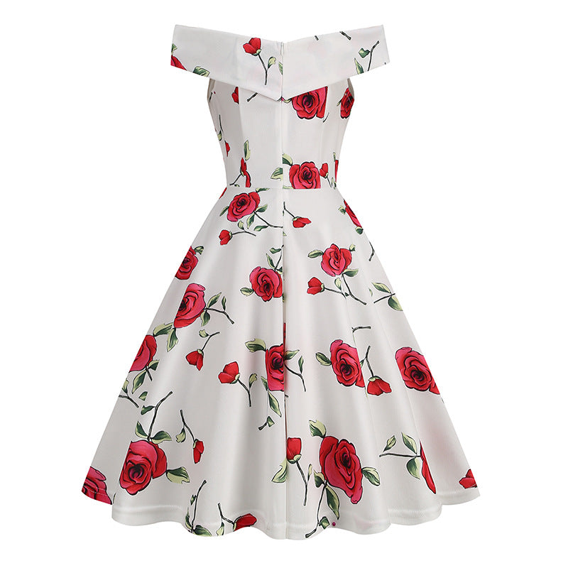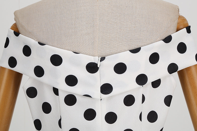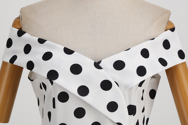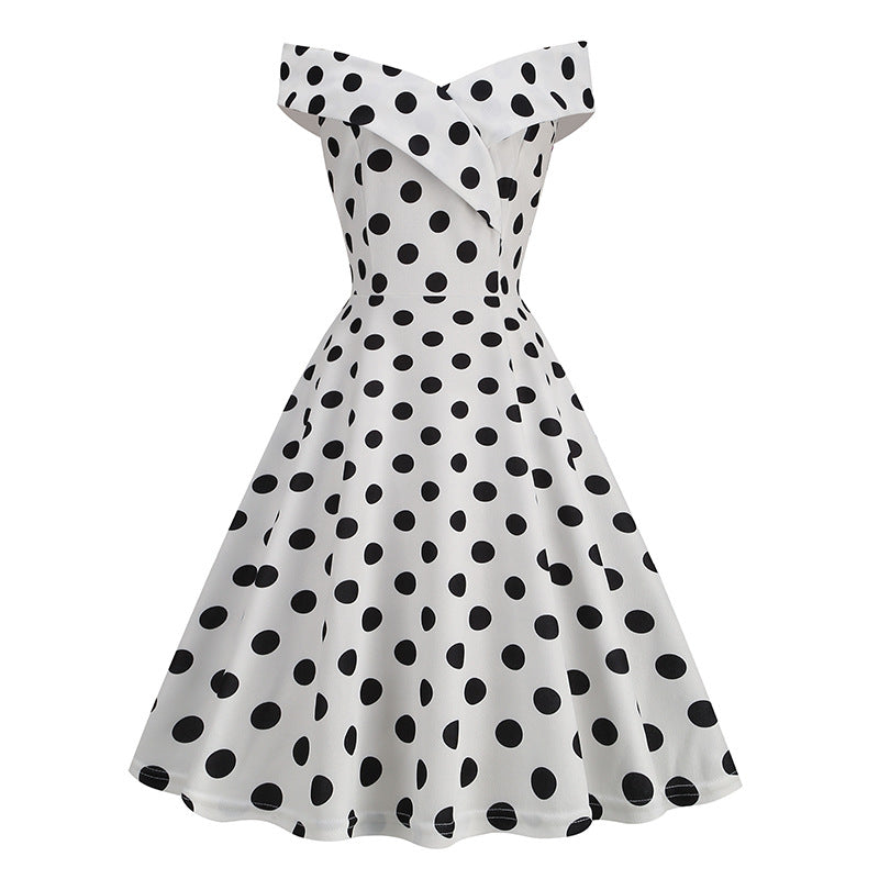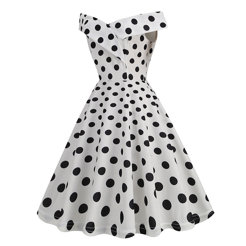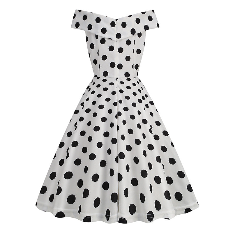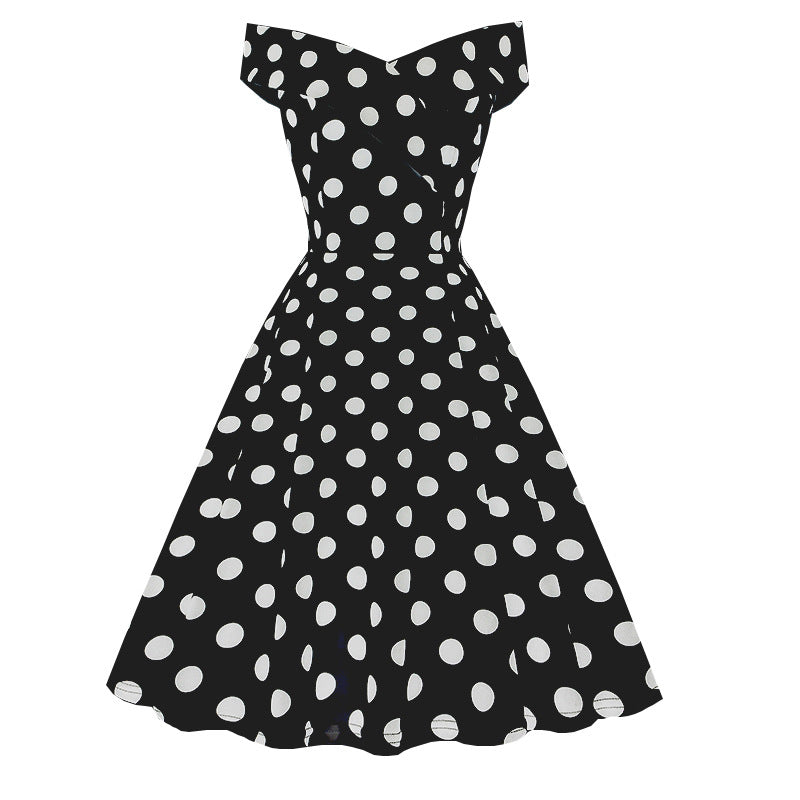 Step back in time to the 1950s with our Black Off Shoulder Polka Dot Vintage Dress. Its A-line cut flatters any figure, and the off-shoulder style adds a timeless touch. The playful polka dots and black fabric give off a vintage vibe, making it perfect for any event.