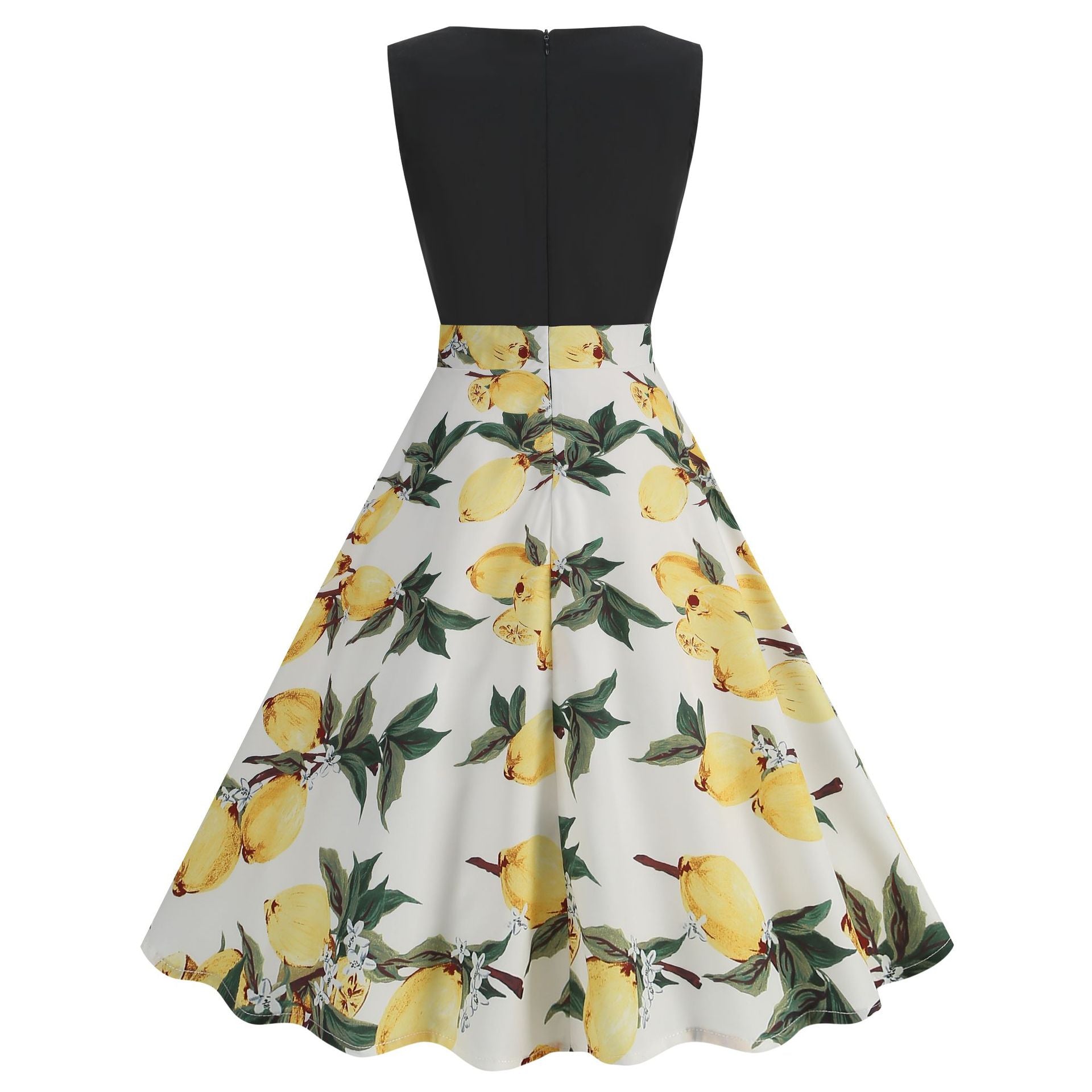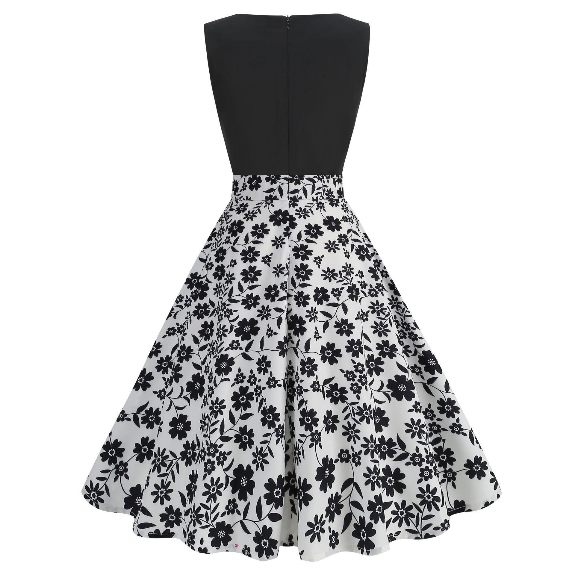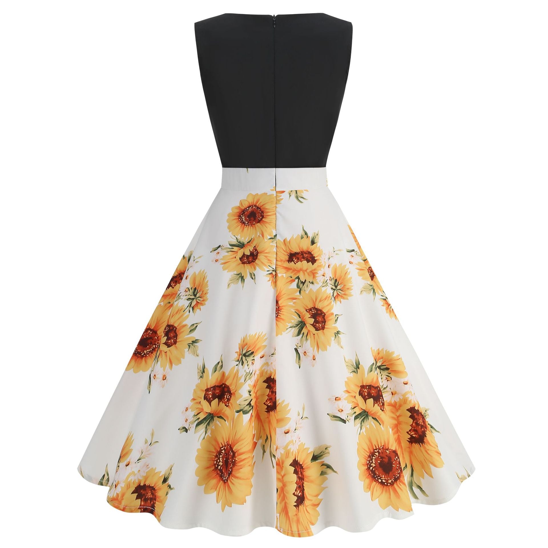 Step back in time with our Sleeveless Retro Sunflower Print Vintage Dress. This dress boasts a classic A-line design that flatters your figure, and the bright sunflower pattern adds a delightful touch. The combination of a black bodice and floral skirt exudes timeless elegance, making it the perfect choice for any occasion.