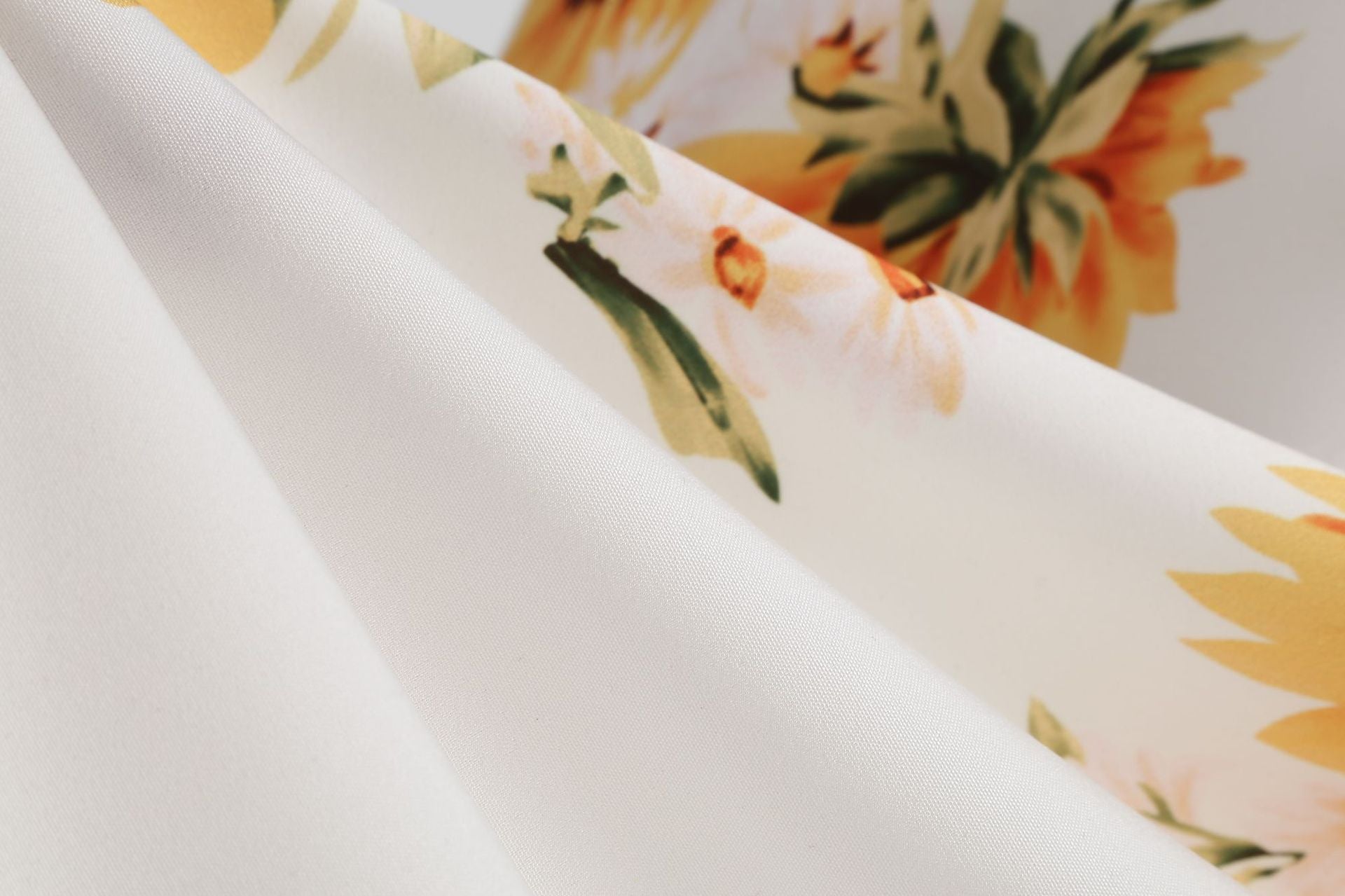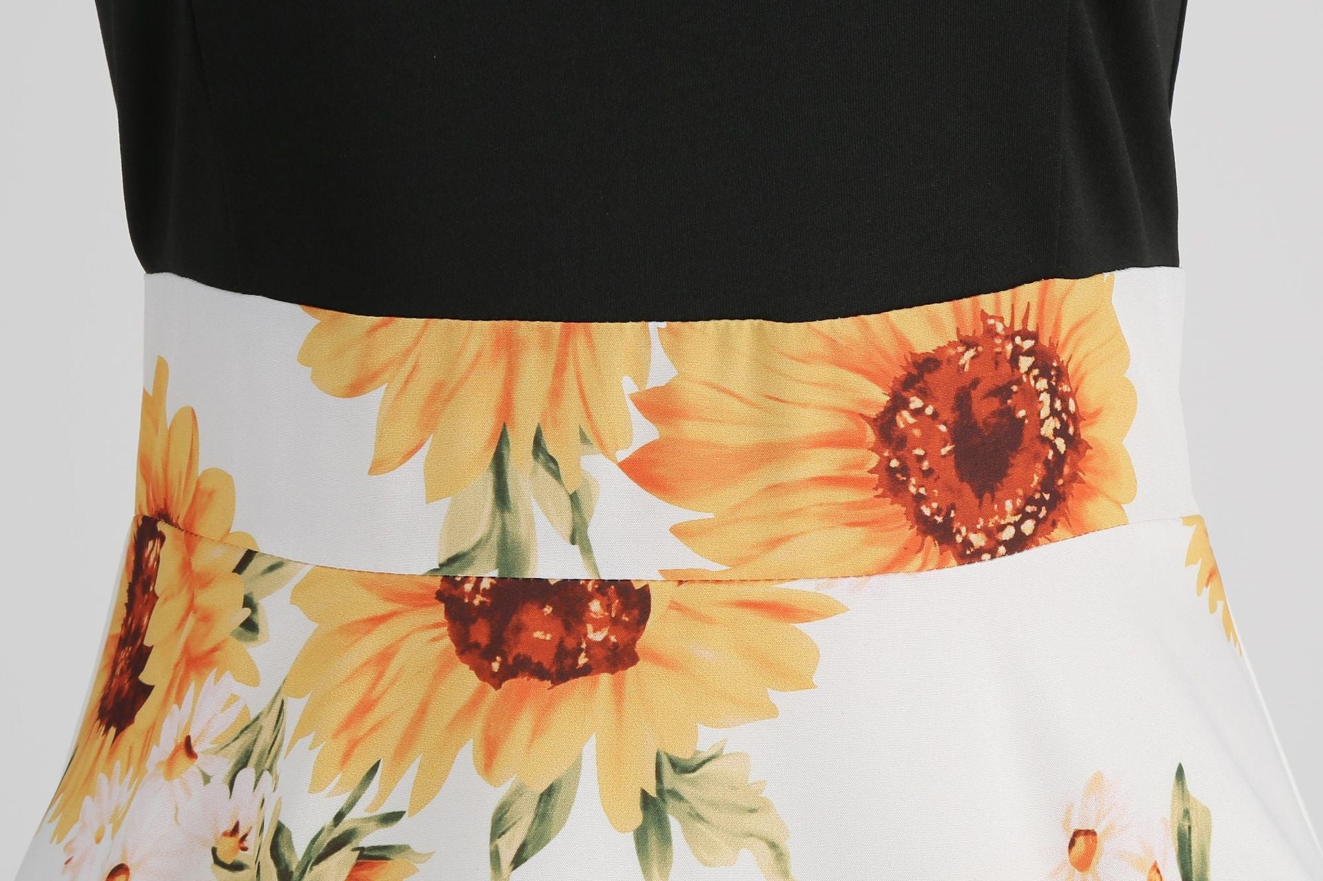 • Color and Pattern: Black bodice with a white skirt adorned with vibrant sunflower prints
