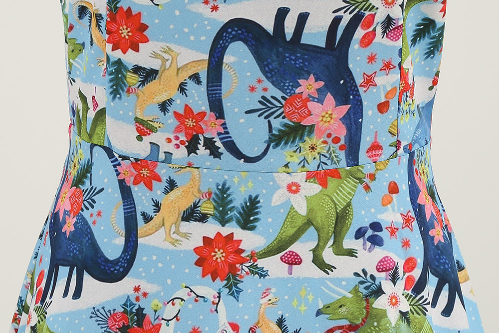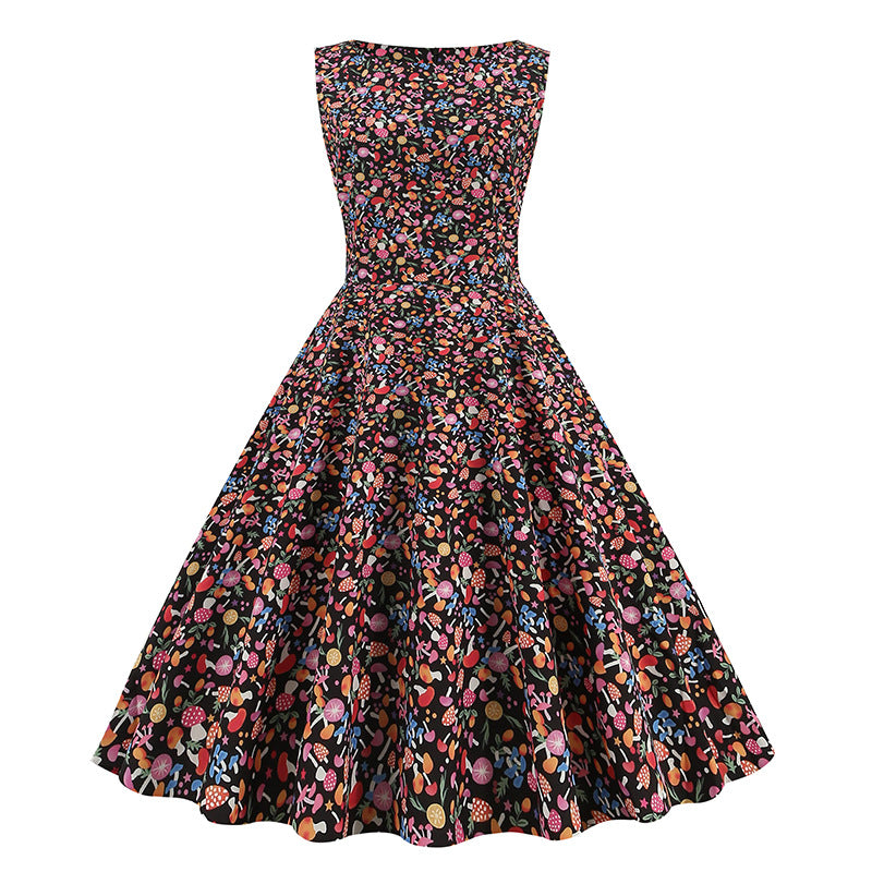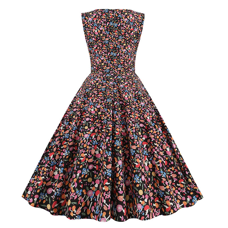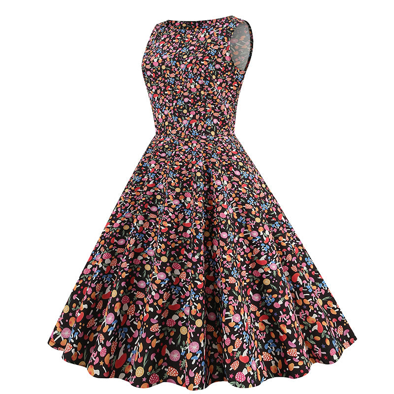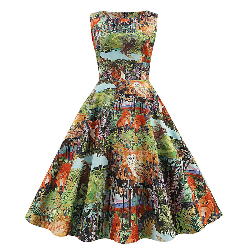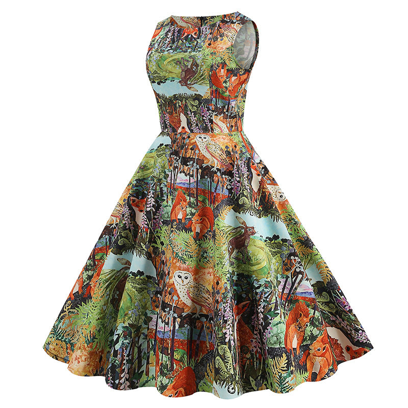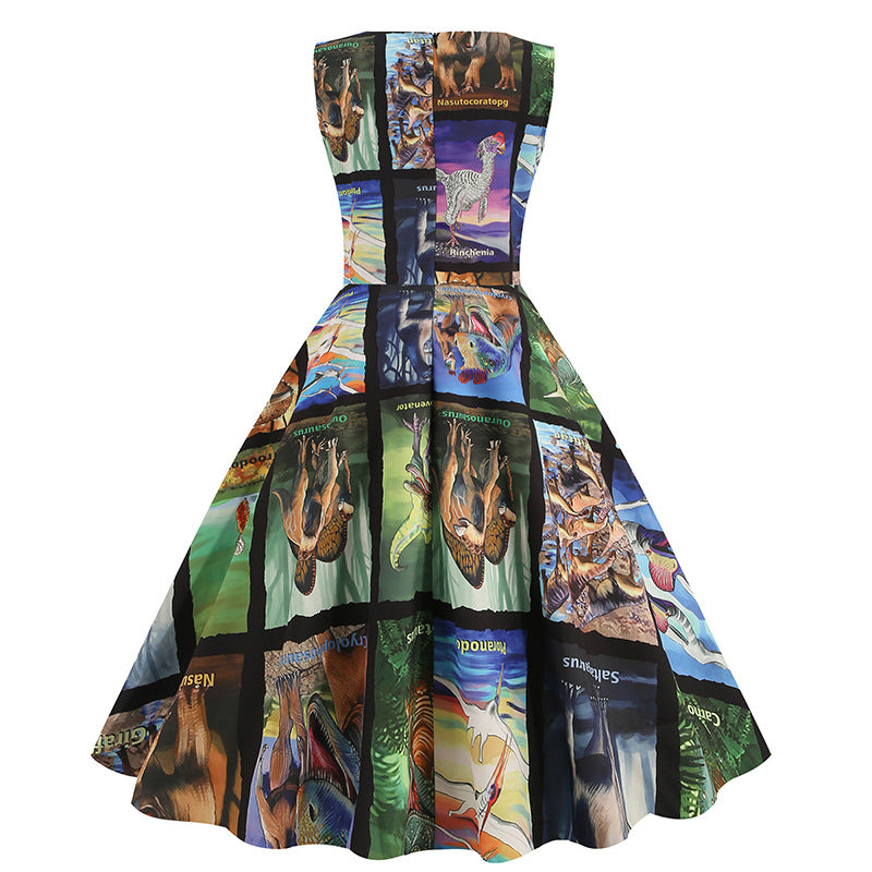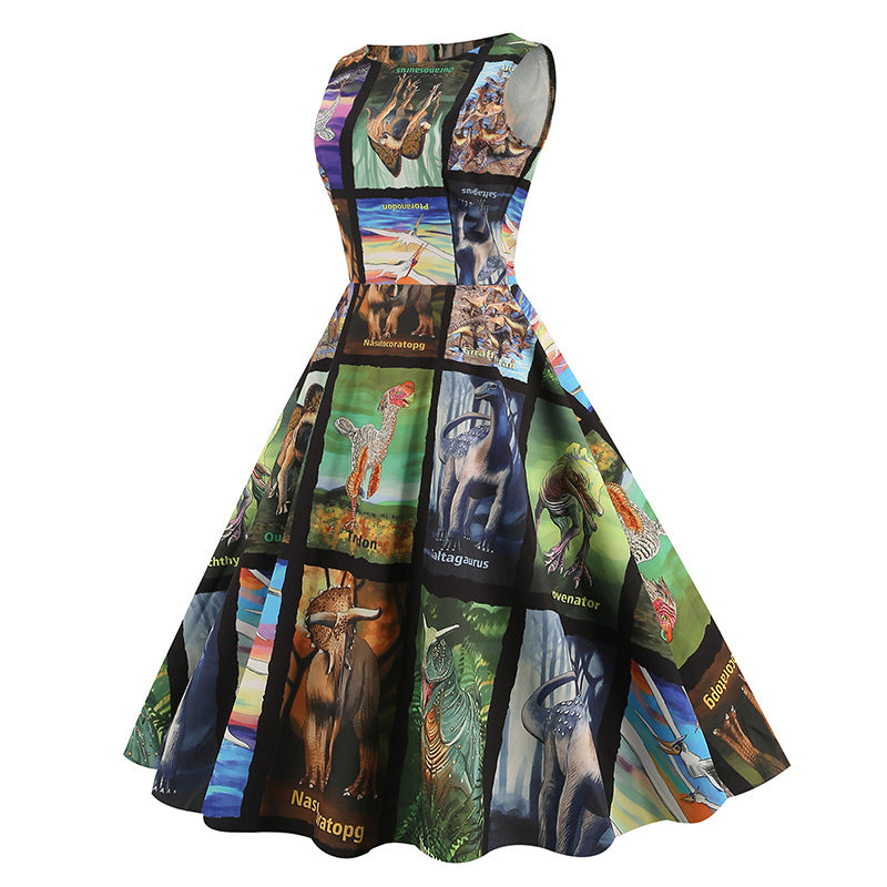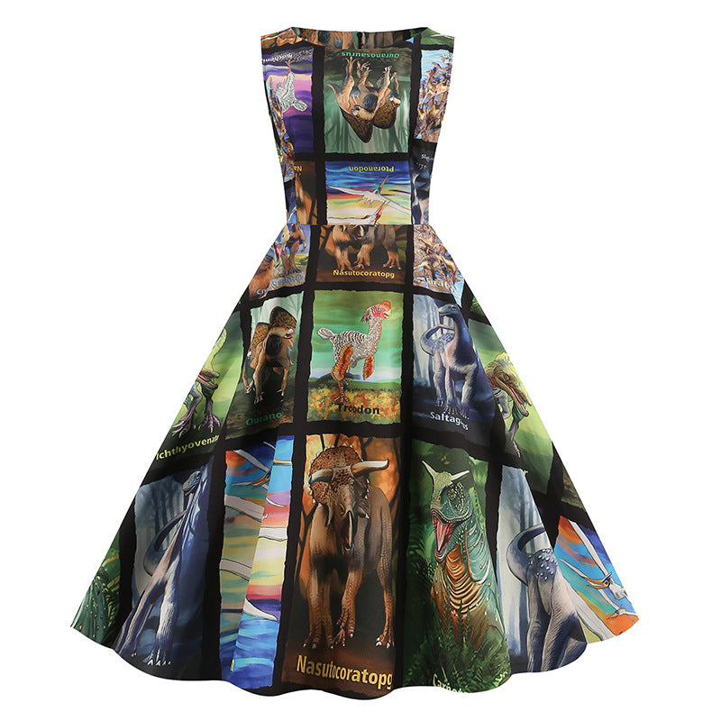 Step back in time with our sleeveless vintage dinosaur dress. Its A-line silhouette flatters any figure, while the round neckline adds a timeless touch. The playful dinosaur print and vibrant fabric give off a vintage vibe, making it perfect for any occasion.