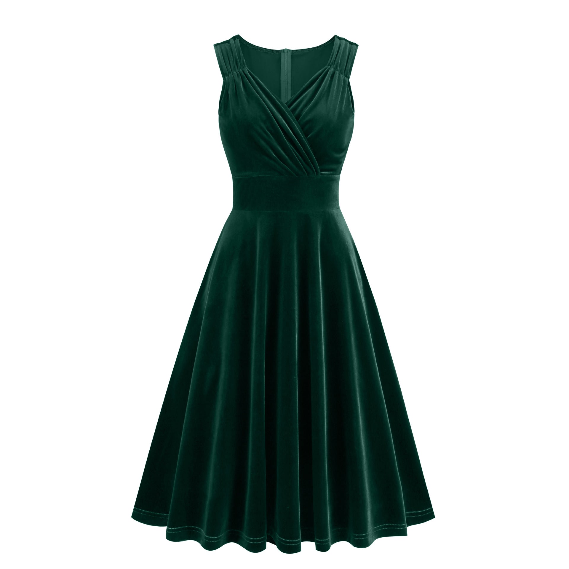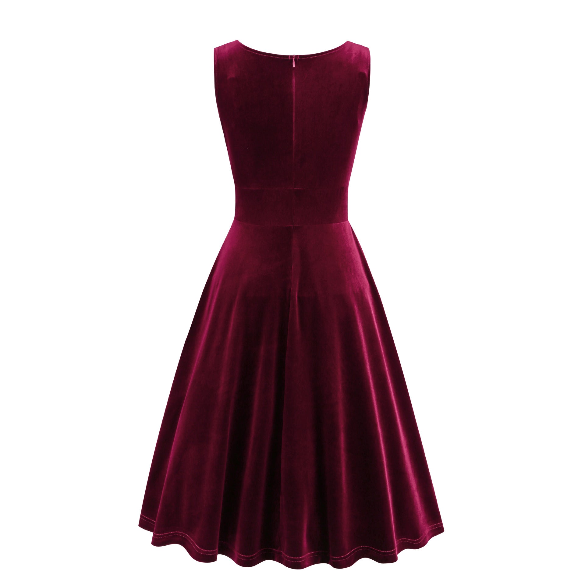 Welcome timeless elegance with our Burgundy Velvet Sleeveless Vintage Dress. This classic A-line fit flatters your figure, while the deep V-neckline gives a sophisticated touch. The rich velvet fabric exudes luxury, making it the perfect choice for special events.