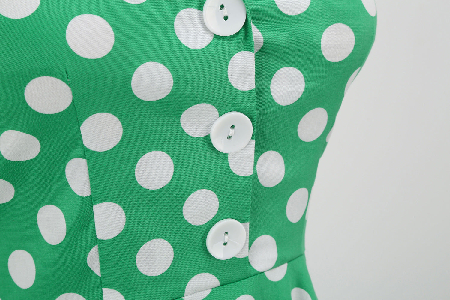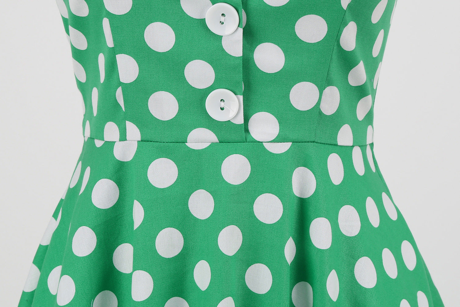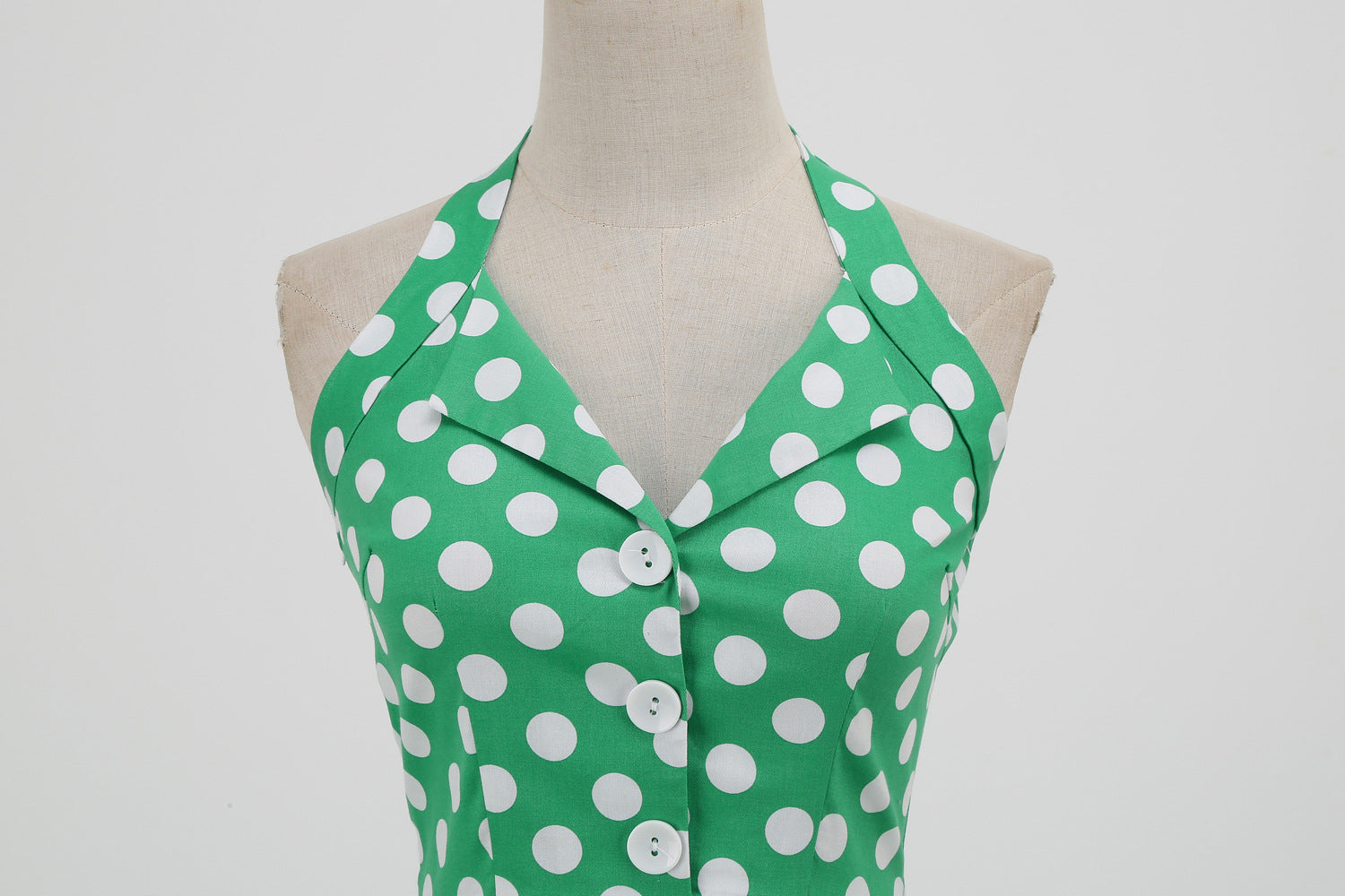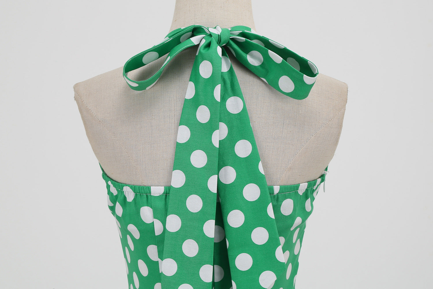 1950S Green Retro Polka Dot Halter Belted Sleeveless Vintage Dress