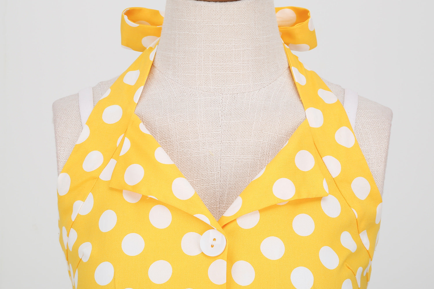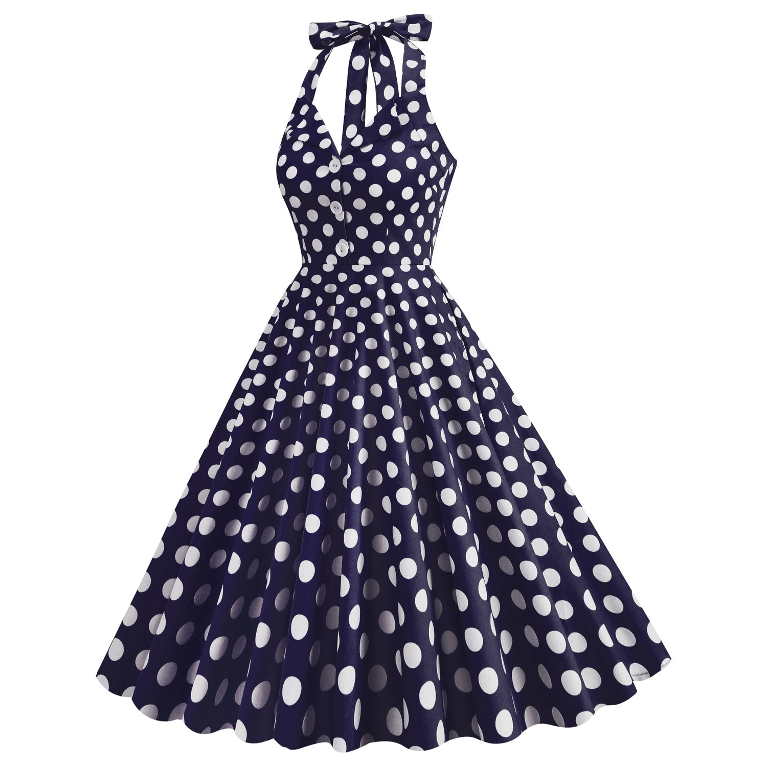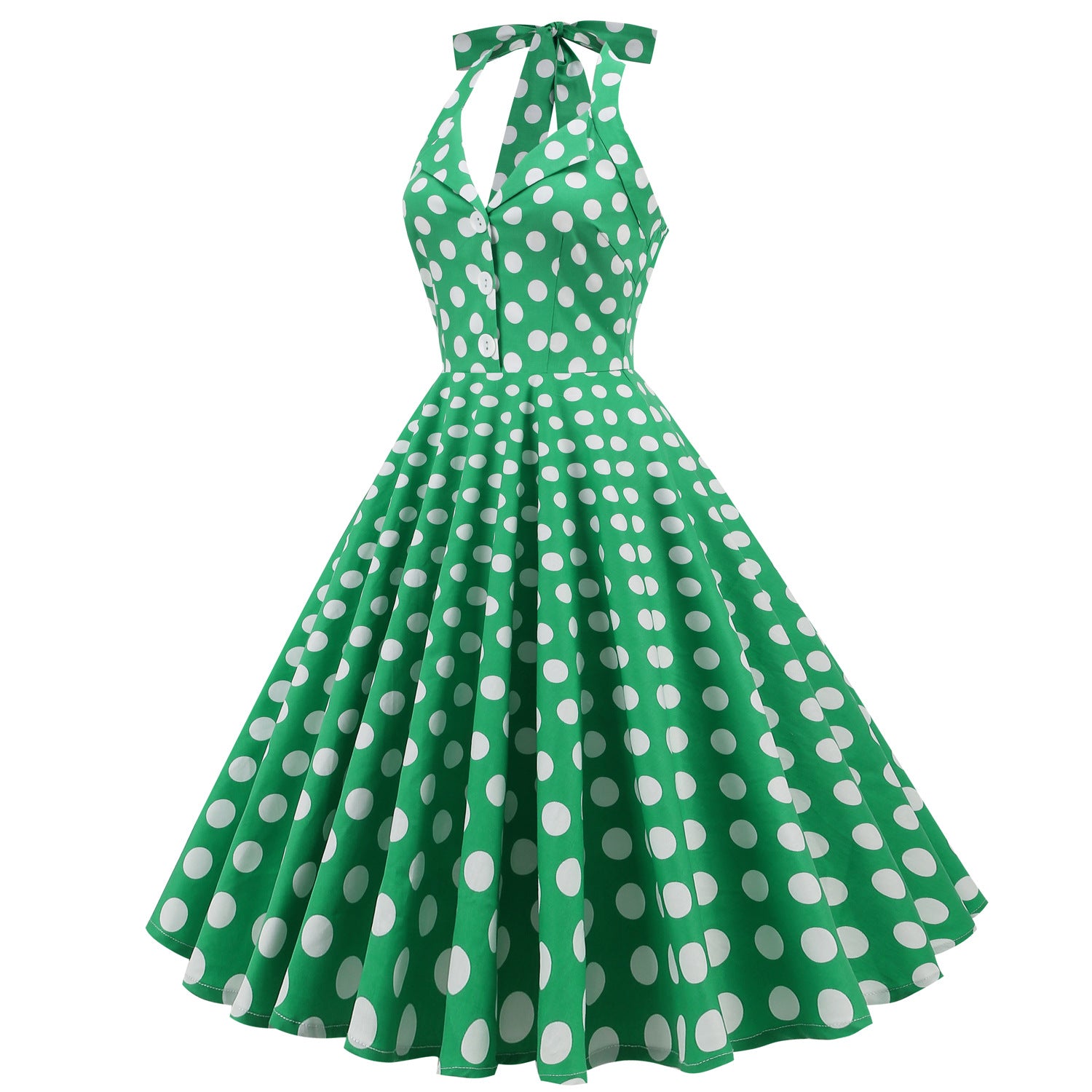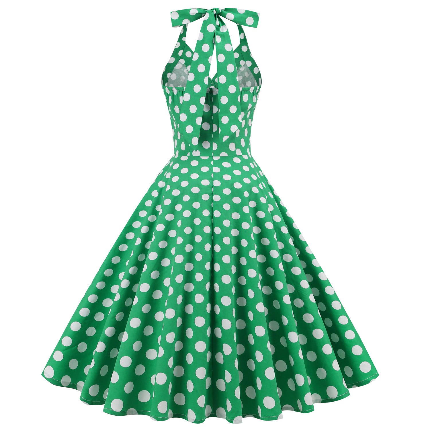1950S Green Retro Polka Dot Halter Belted Sleeveless Vintage Dress