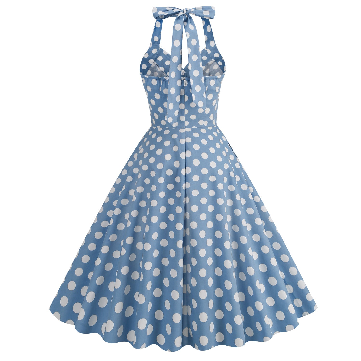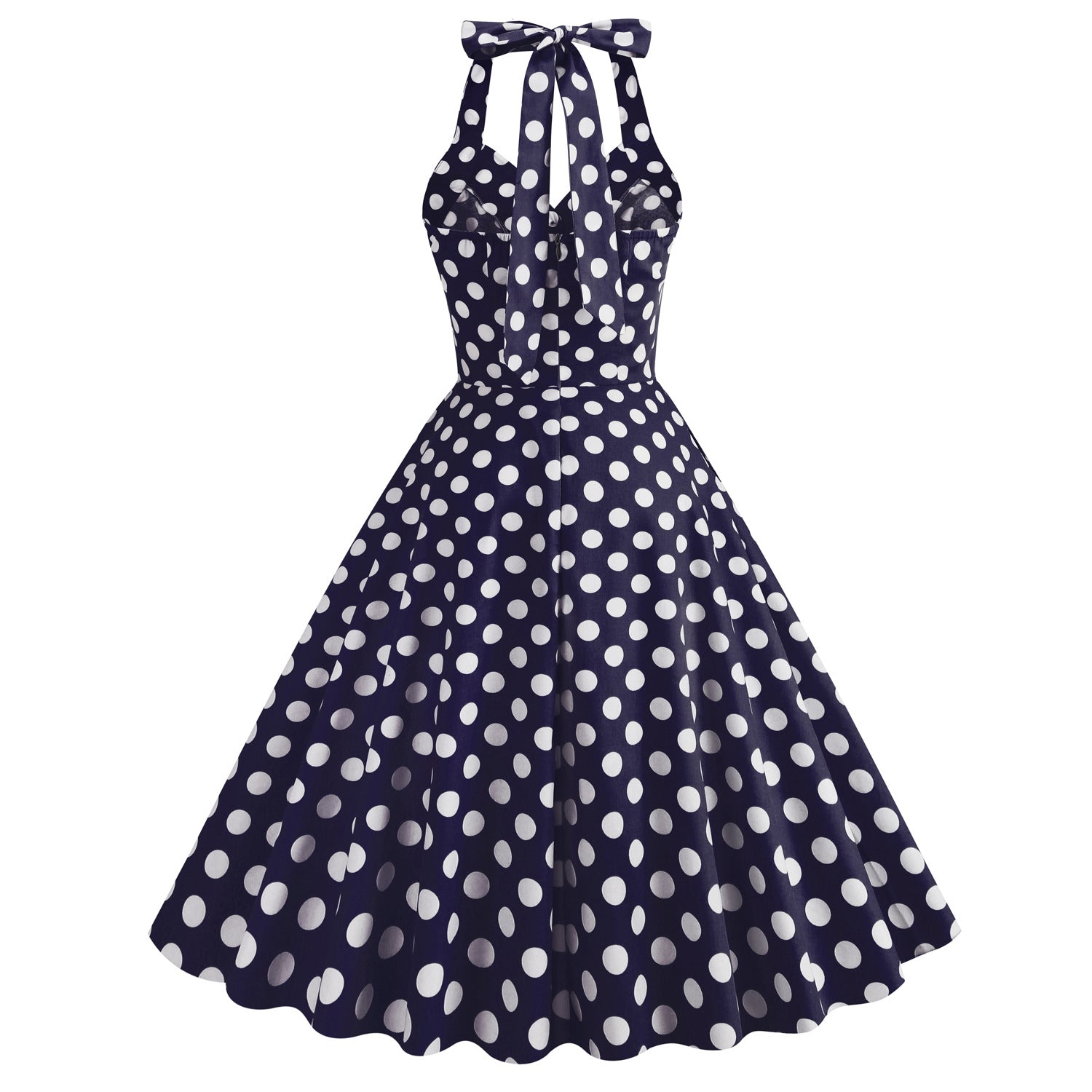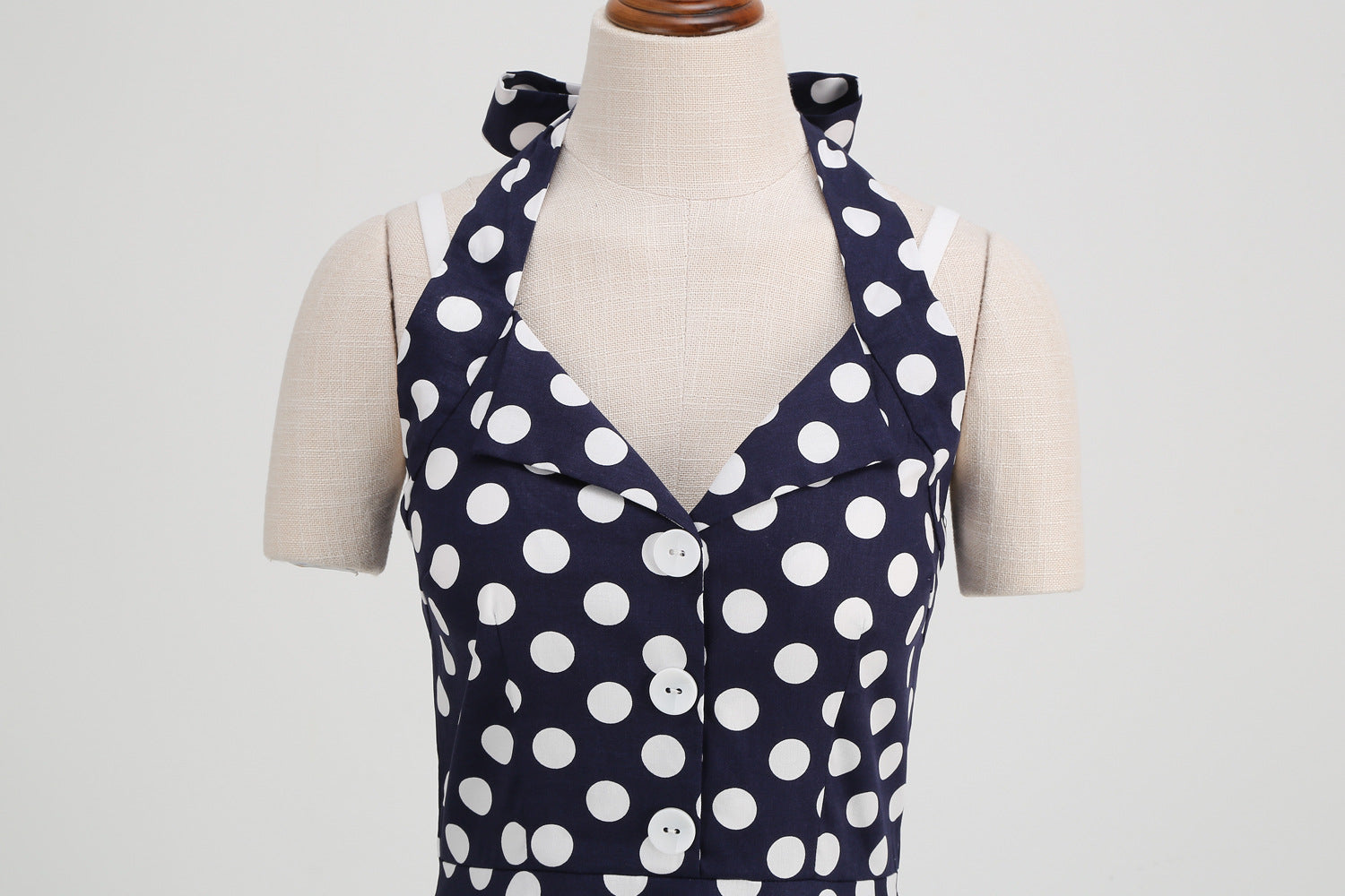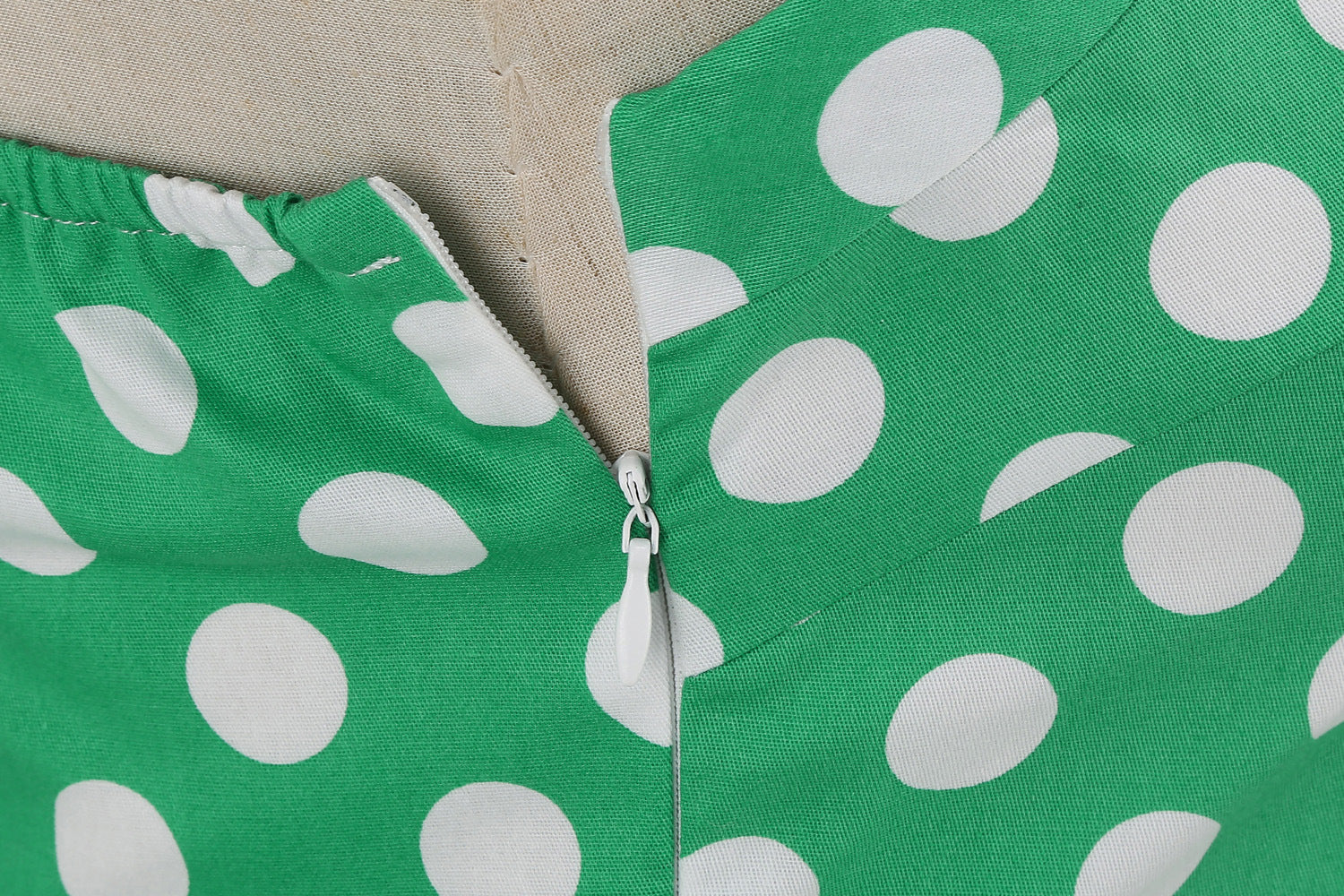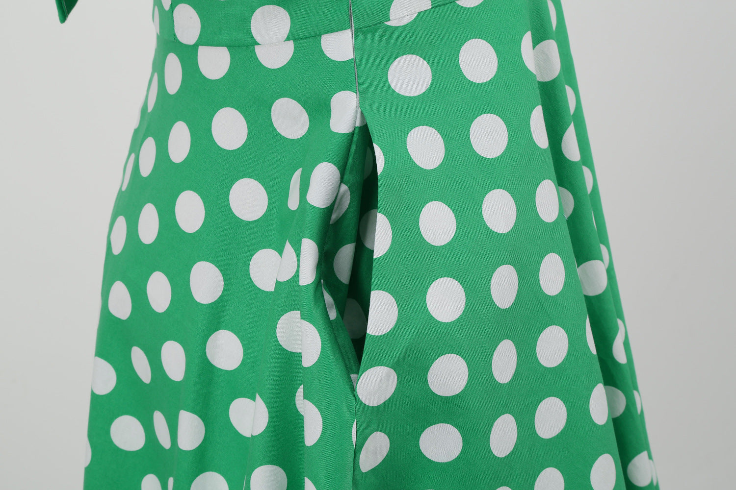 The 1950s come alive with our Green Retro Polka Dot Halter Belted Sleeveless Vintage Dress. Its timeless halter neckline and A-line silhouette create a flattering and classic look. The charming polka dots and vibrant green fabric add a touch of vintage flair, making it the perfect choice for any event.