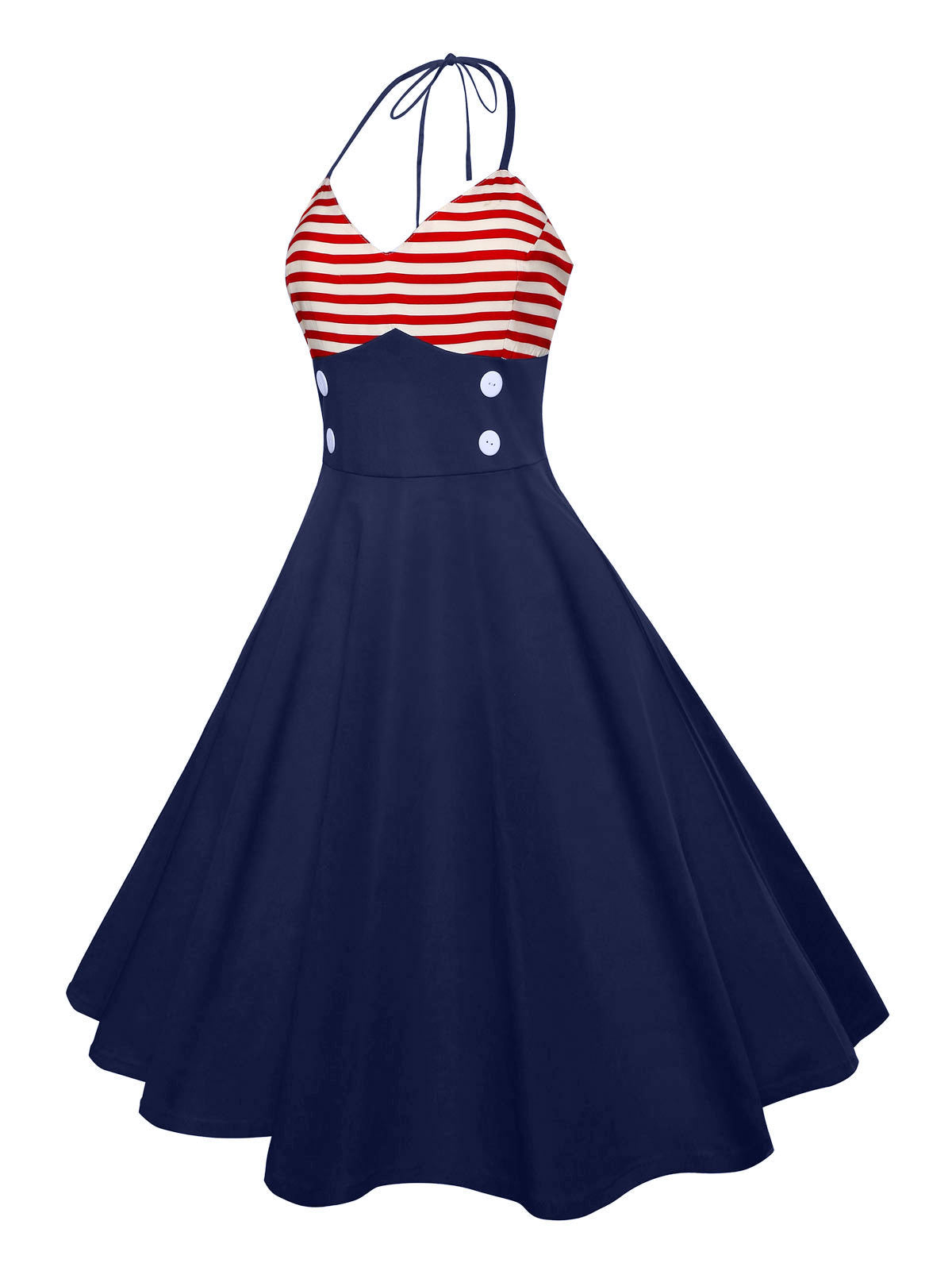 Experience a classic 1950s look in our Vintage Navy Blue Buttoned Halter Striped Top Dress. Its A-line style is designed to flatter, and the halter neckline adds a timeless touch. The playful red and white stripes, combined with the navy blue fabric, give off a vintage charm, making it a versatile option for any occasion.