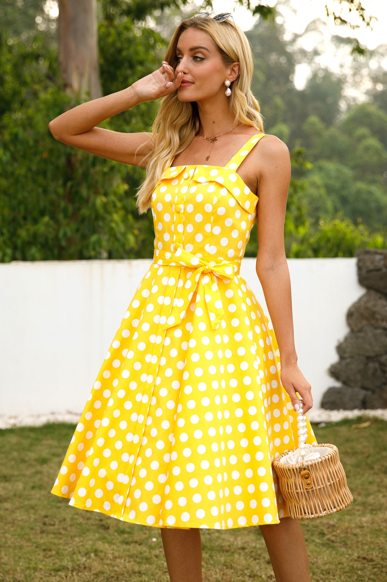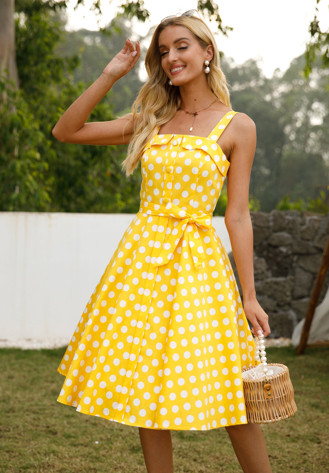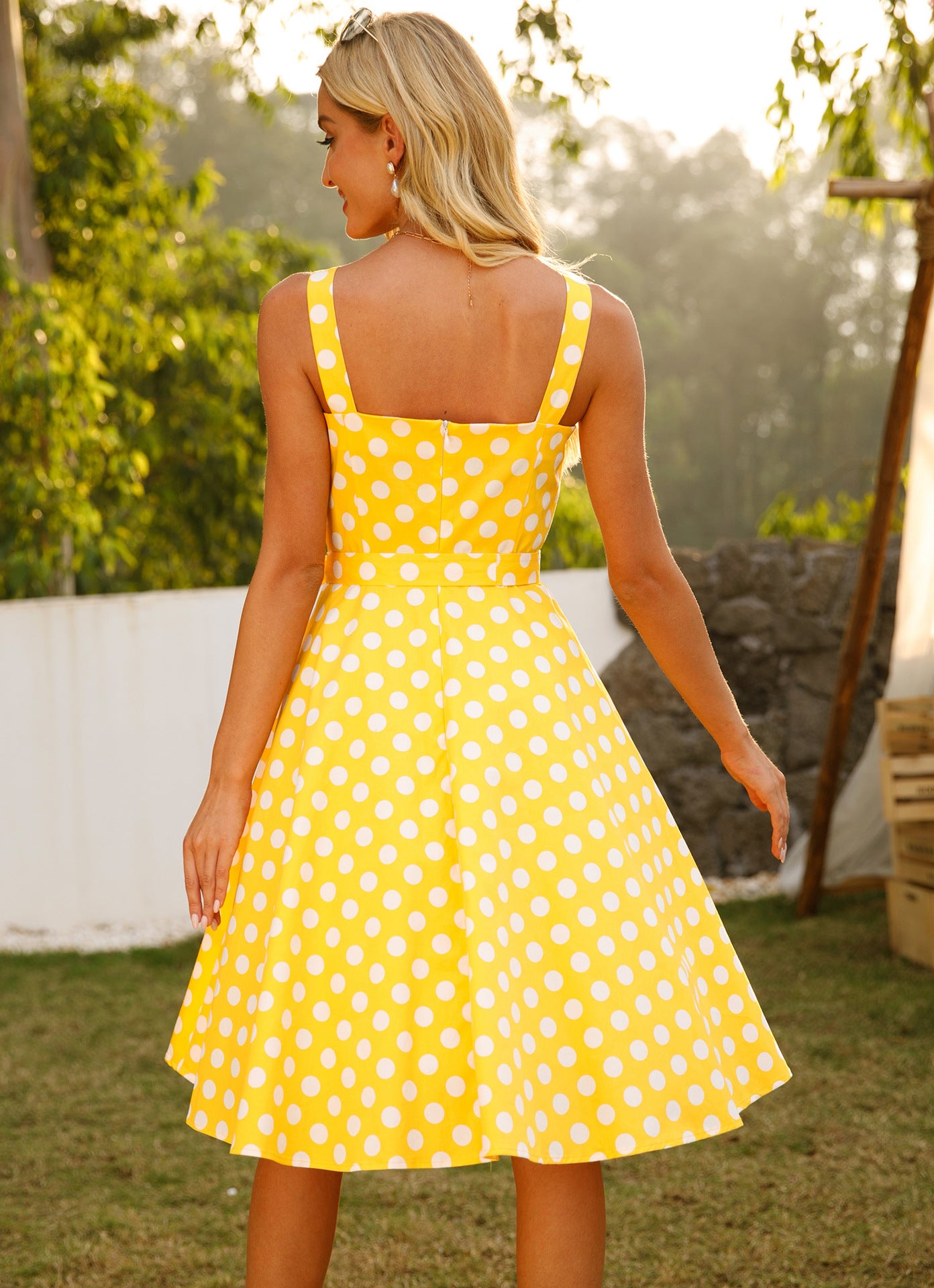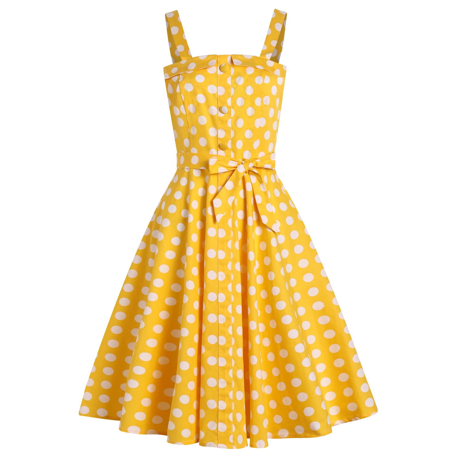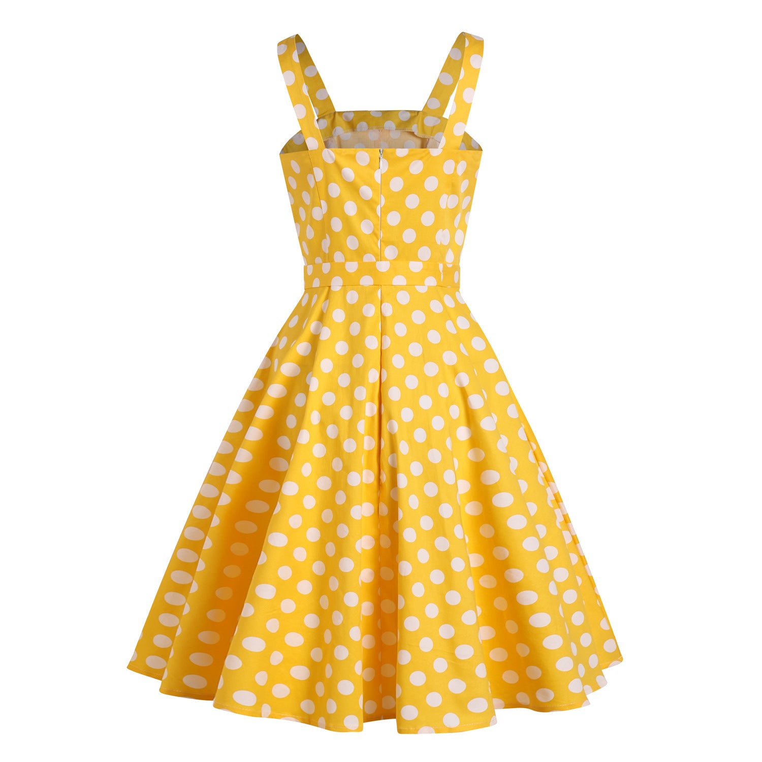 Immerse yourself in the 1950s with our charming Retro Polka Dot Spaghetti Strap Belted Vintage Dress. Its timeless A-line design flatters every figure, while the square neckline adds a touch of nostalgia. The playful polka dots and vibrant yellow fabric exude a vintage charm that's perfect for any occasion.