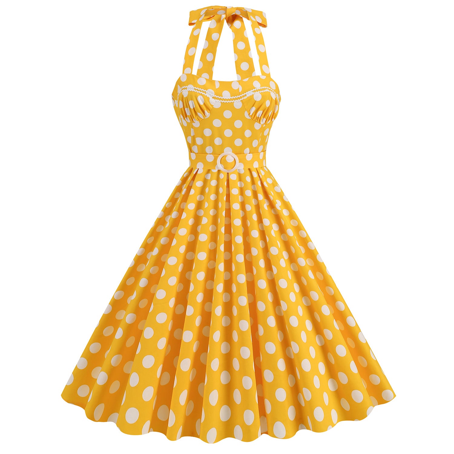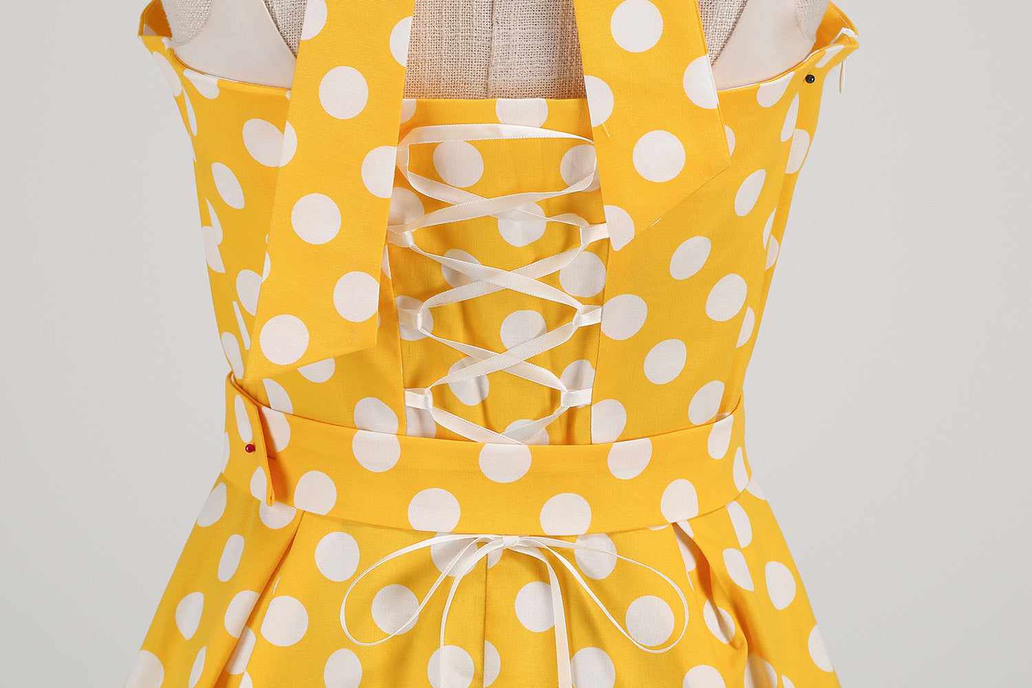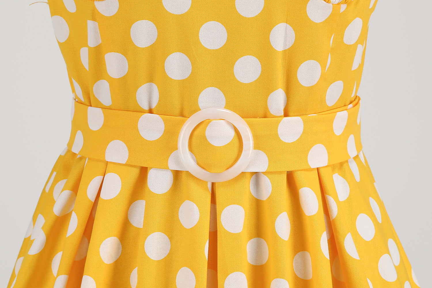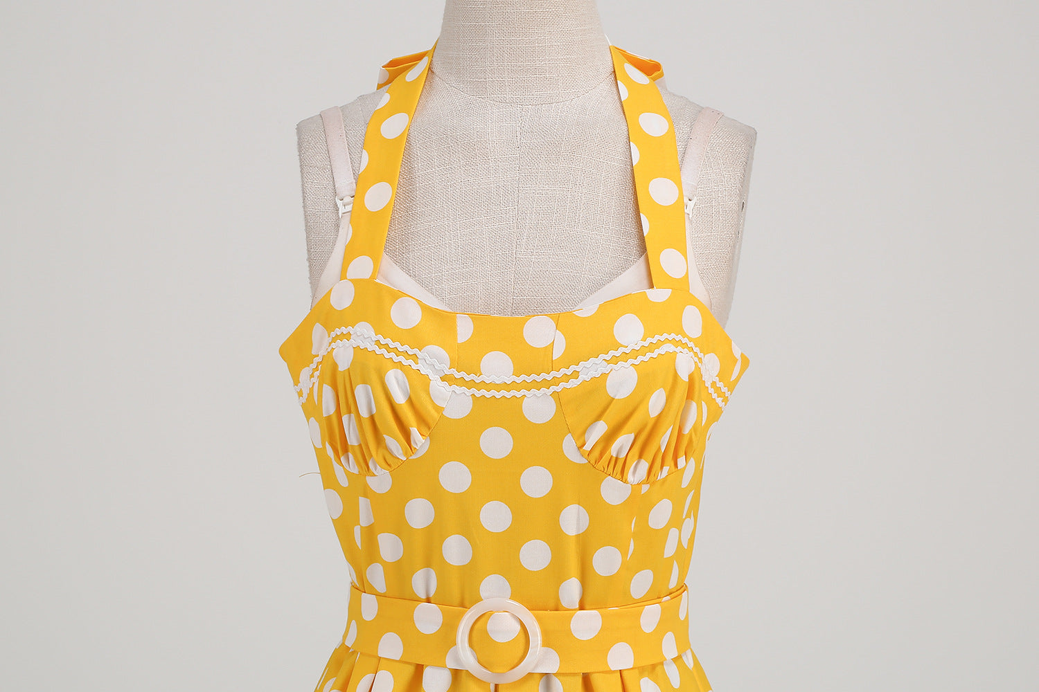 1950S Yellow Retro Polka Dot Halter Belted Vintage Dress