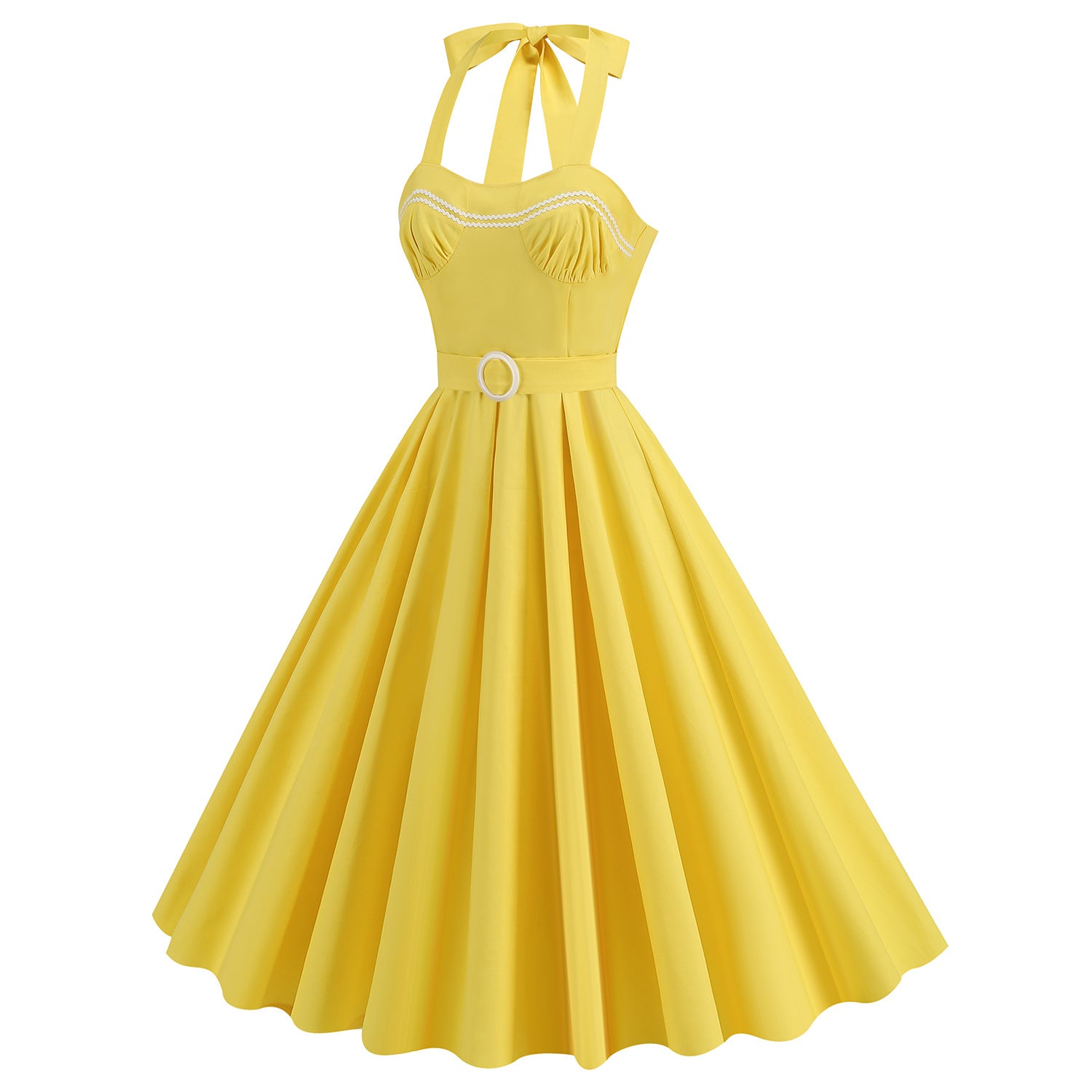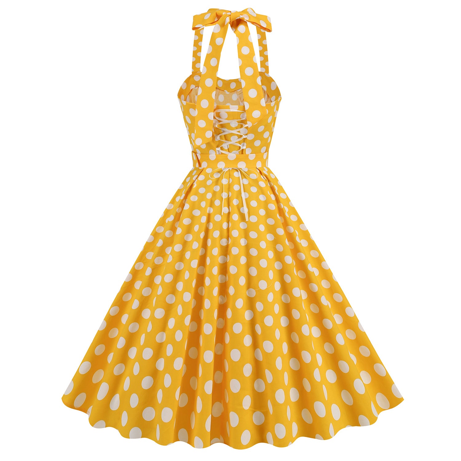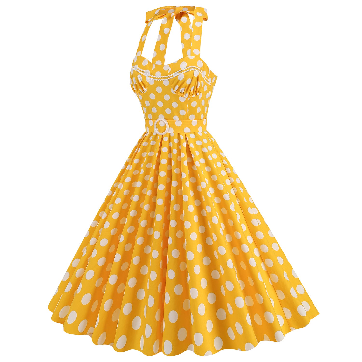 1950S Yellow Retro Polka Dot Halter Belted Vintage Dress