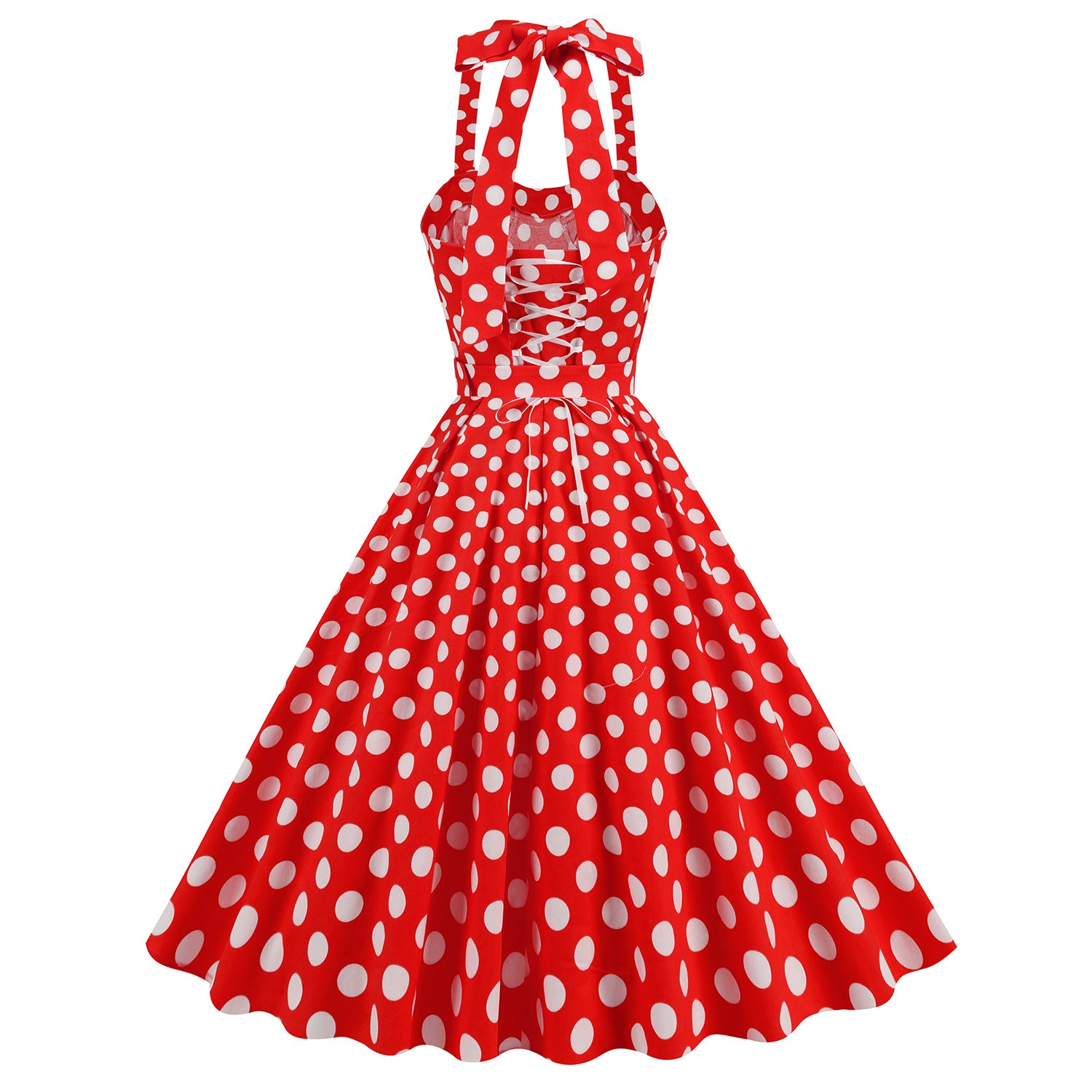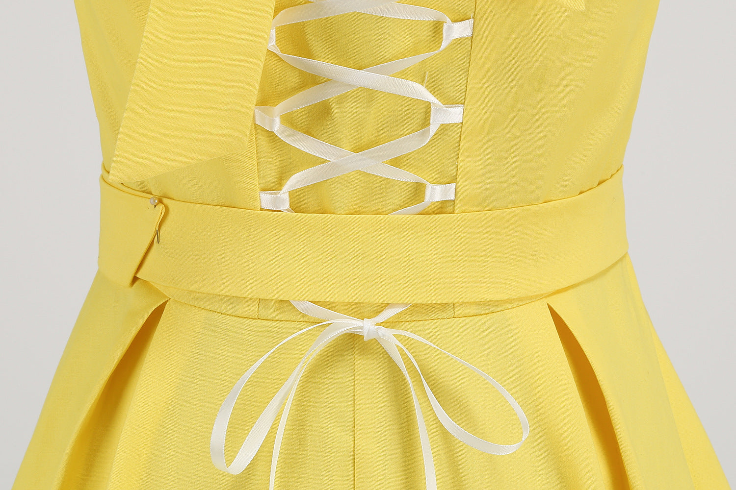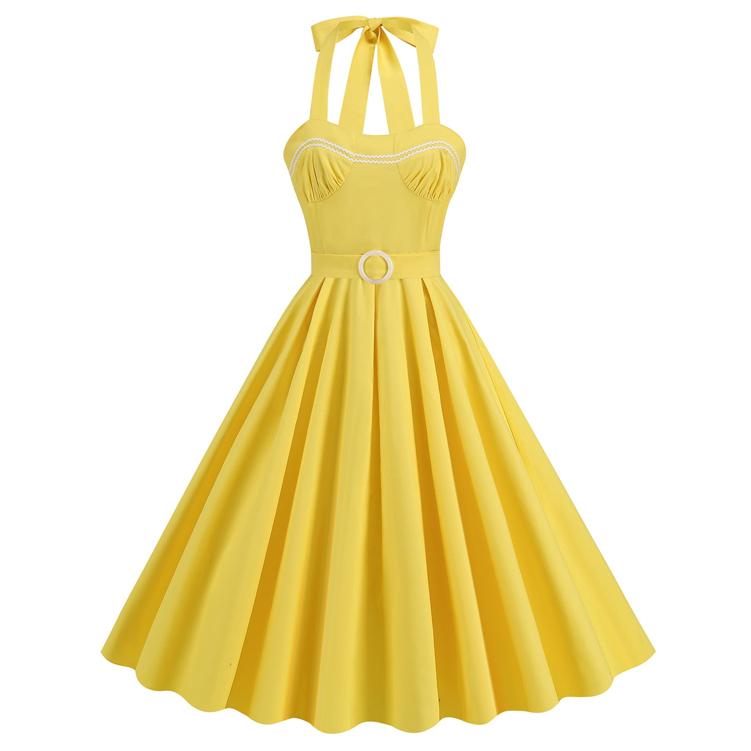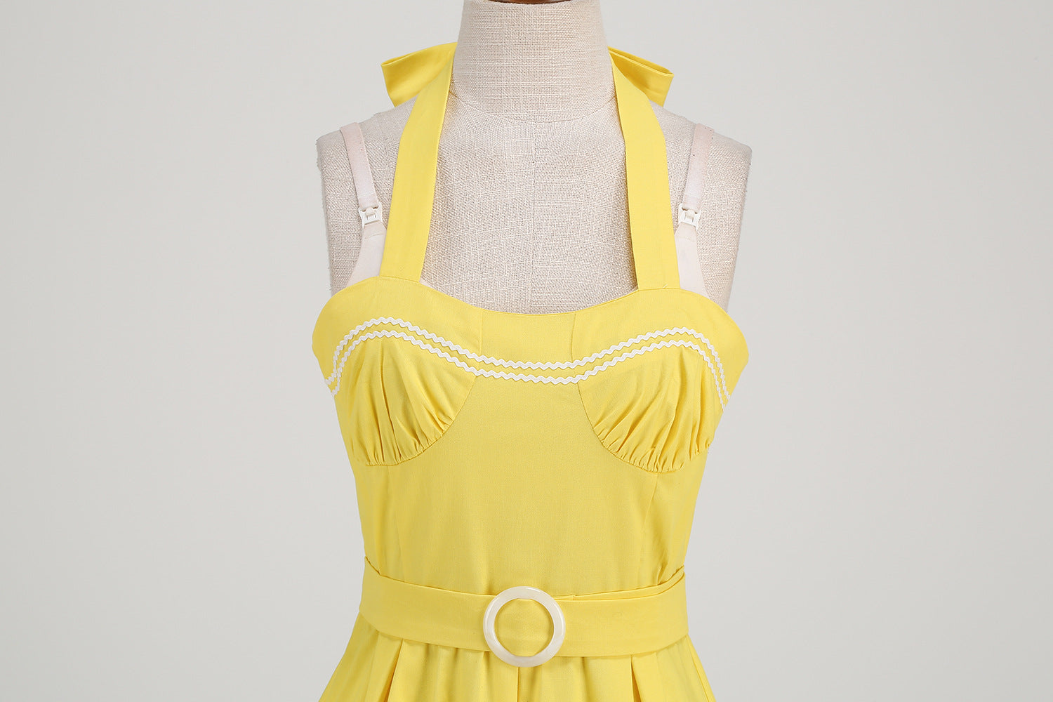 1950S Yellow Retro Polka Dot Halter Belted Vintage Dress