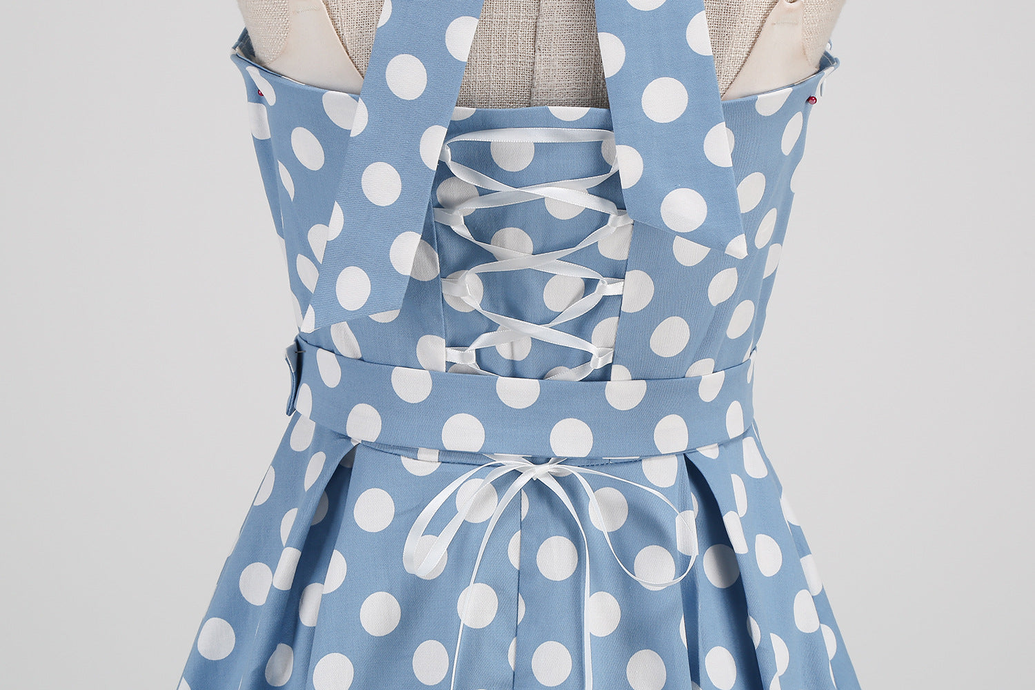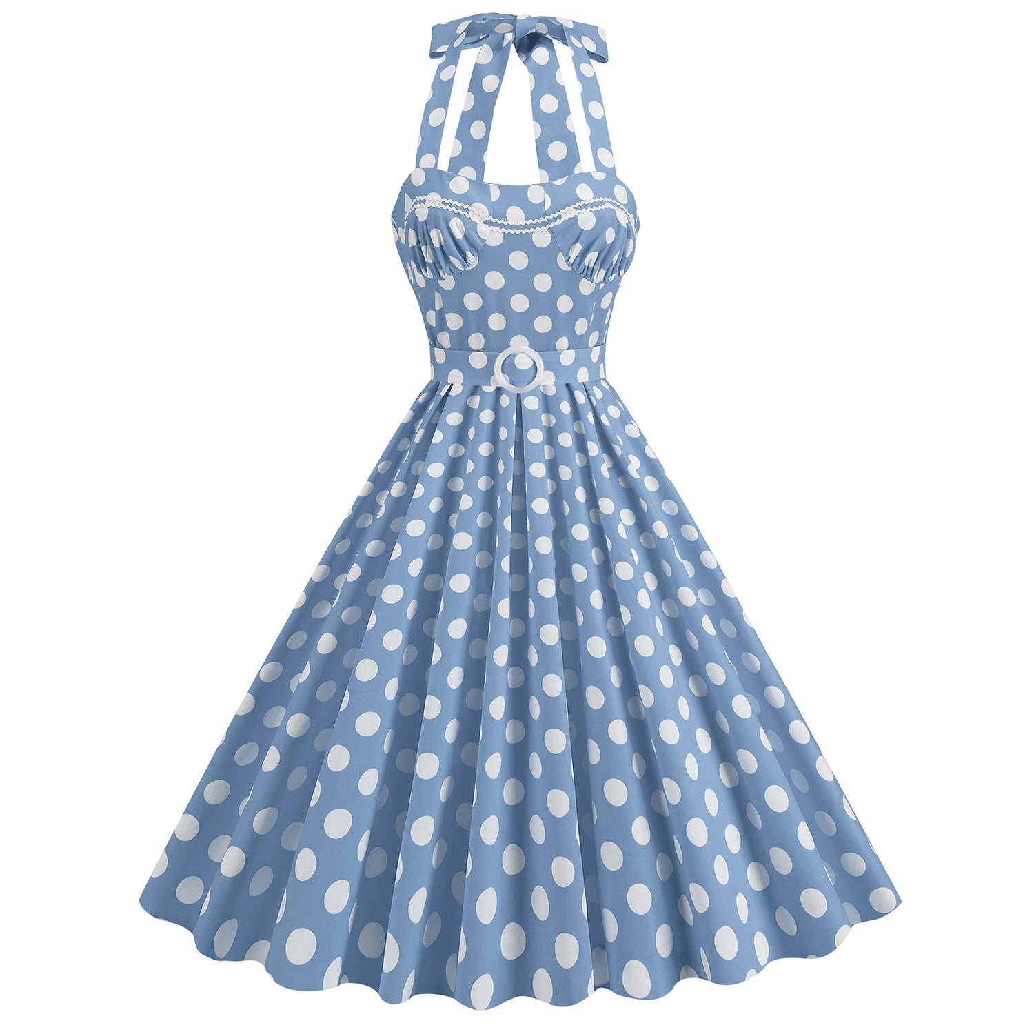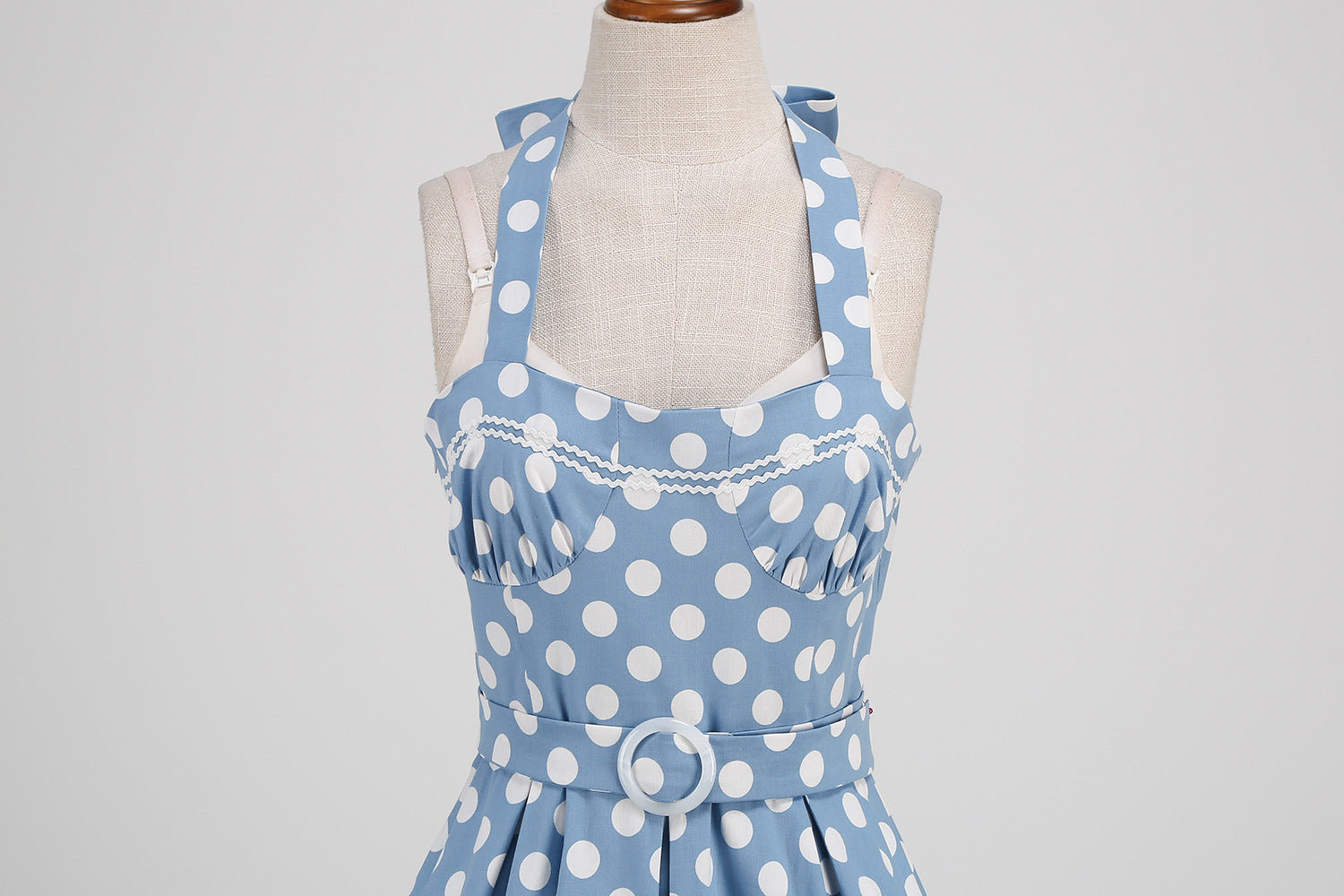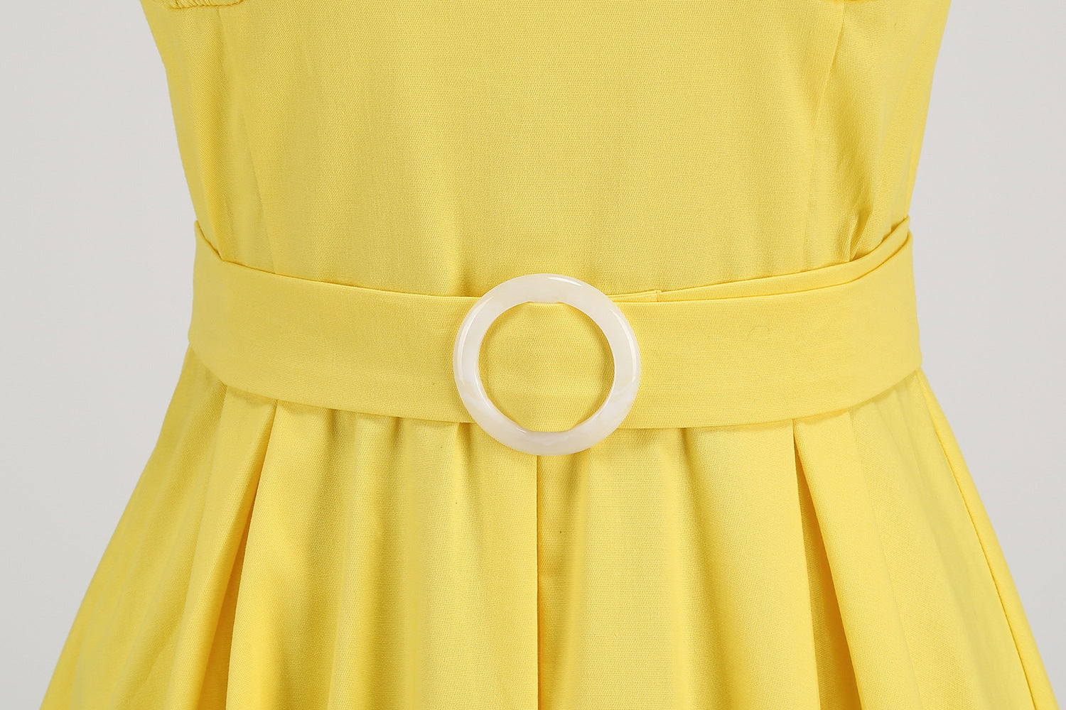 Step back in time with our 1950s Yellow Retro Polka Dot Halter Belted Vintage Dress. Its traditional A-line design provides a flattering silhouette, and the halter neckline adds a timeless element. The adorable white polka dots on a sunny yellow fabric give off a vintage feel, making it perfect for any event.