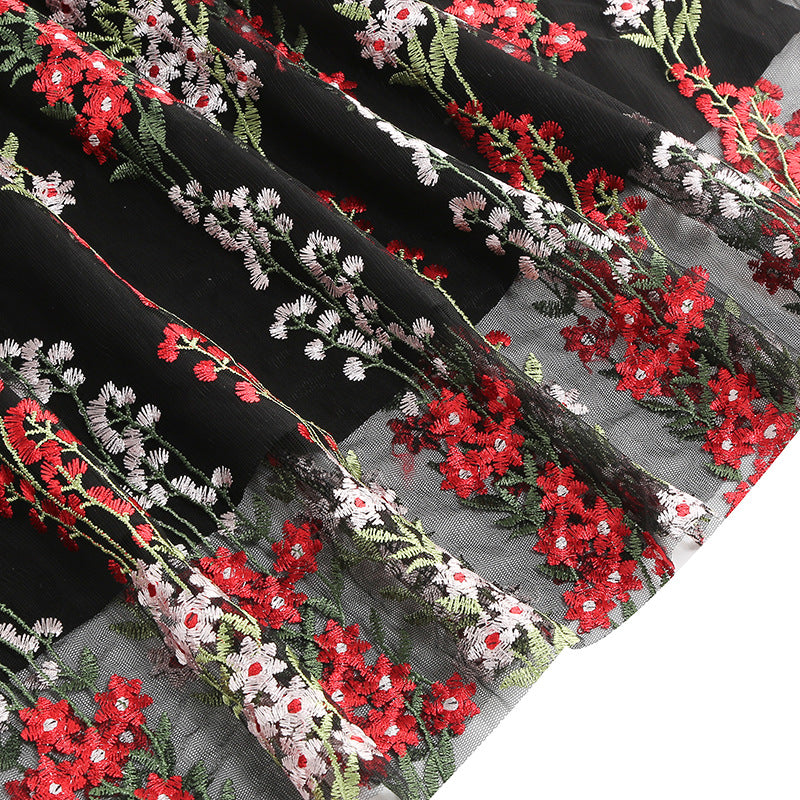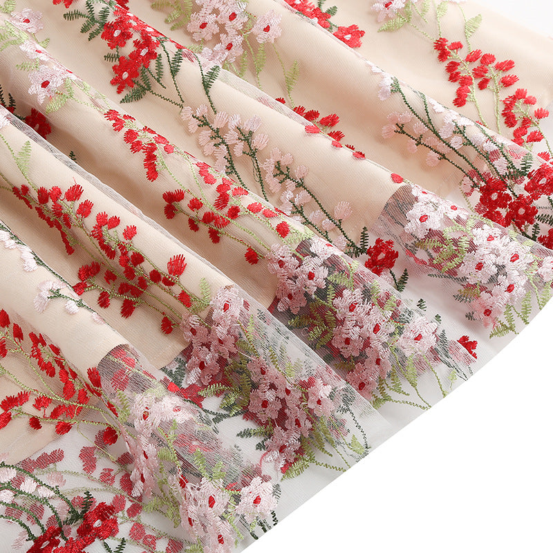 • Color and Pattern: Nude base adorned with vibrant red floral embroidery