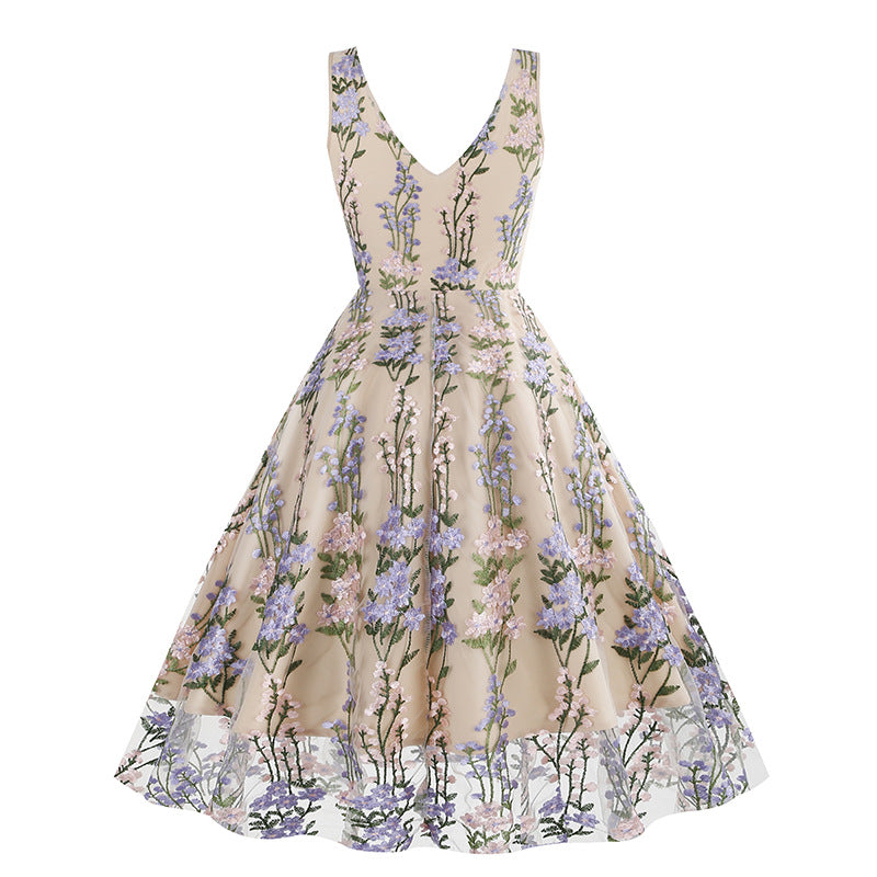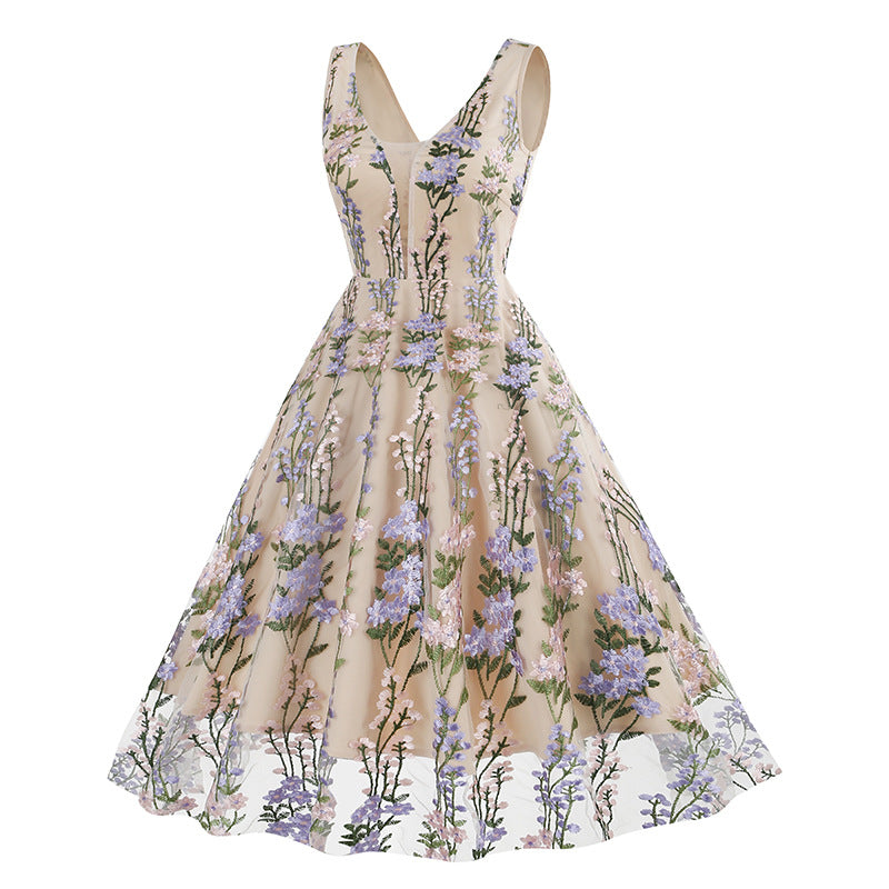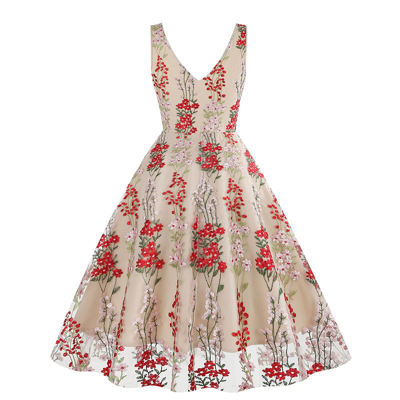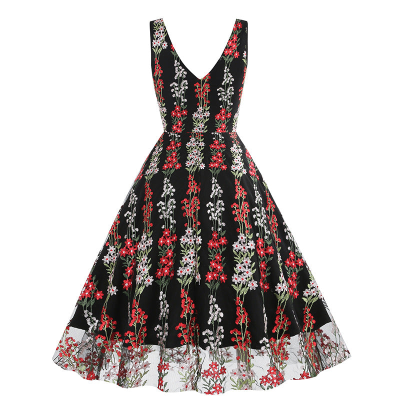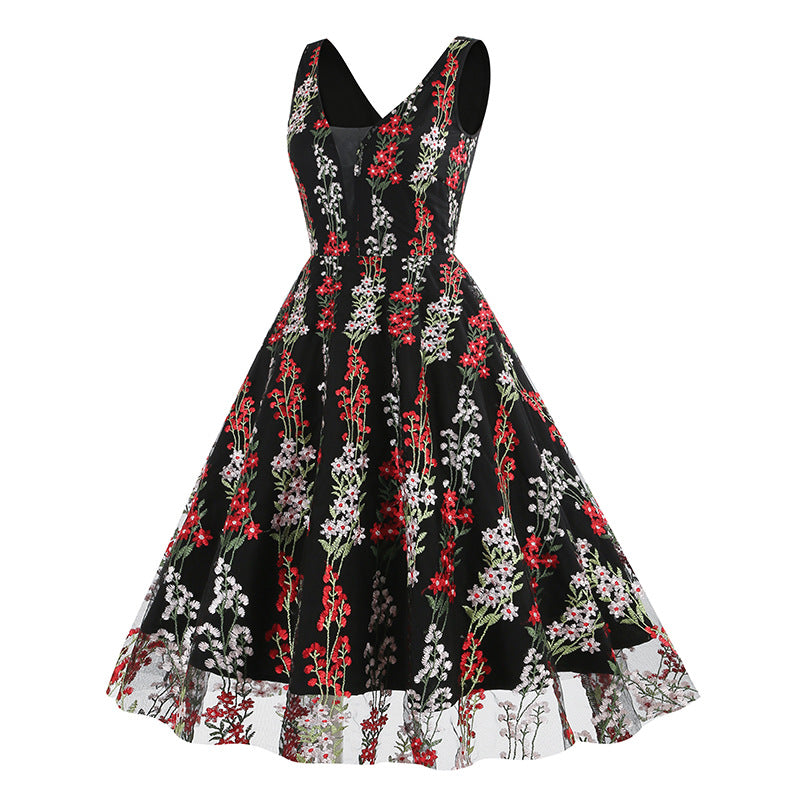 1950S V-Neck Sleeveless Havy Embroidery Retro 50S dress Hepburn Vintage Dress