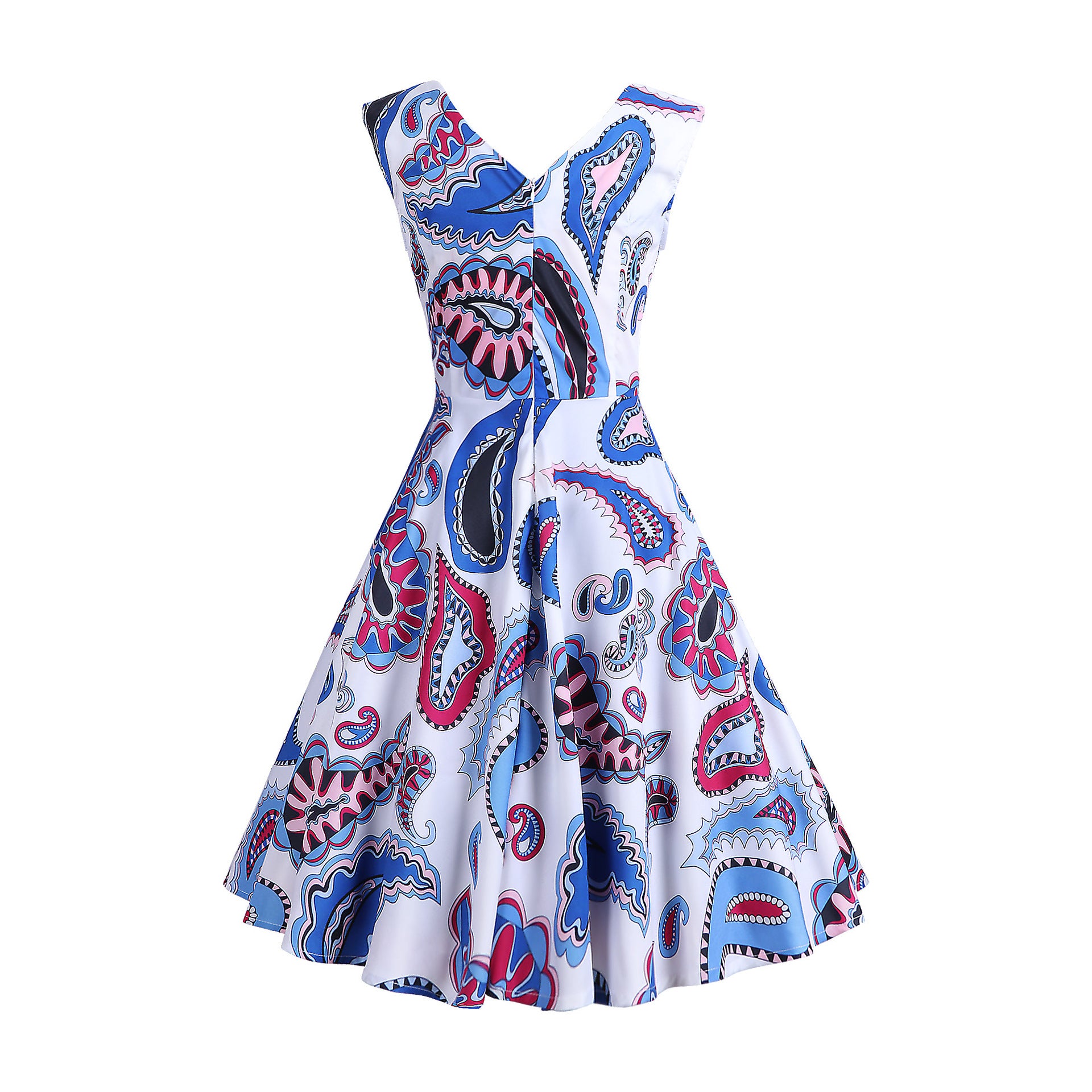 1950S Blue and Pink Paisley Print V-Neck Sleeveless Vintage Dress