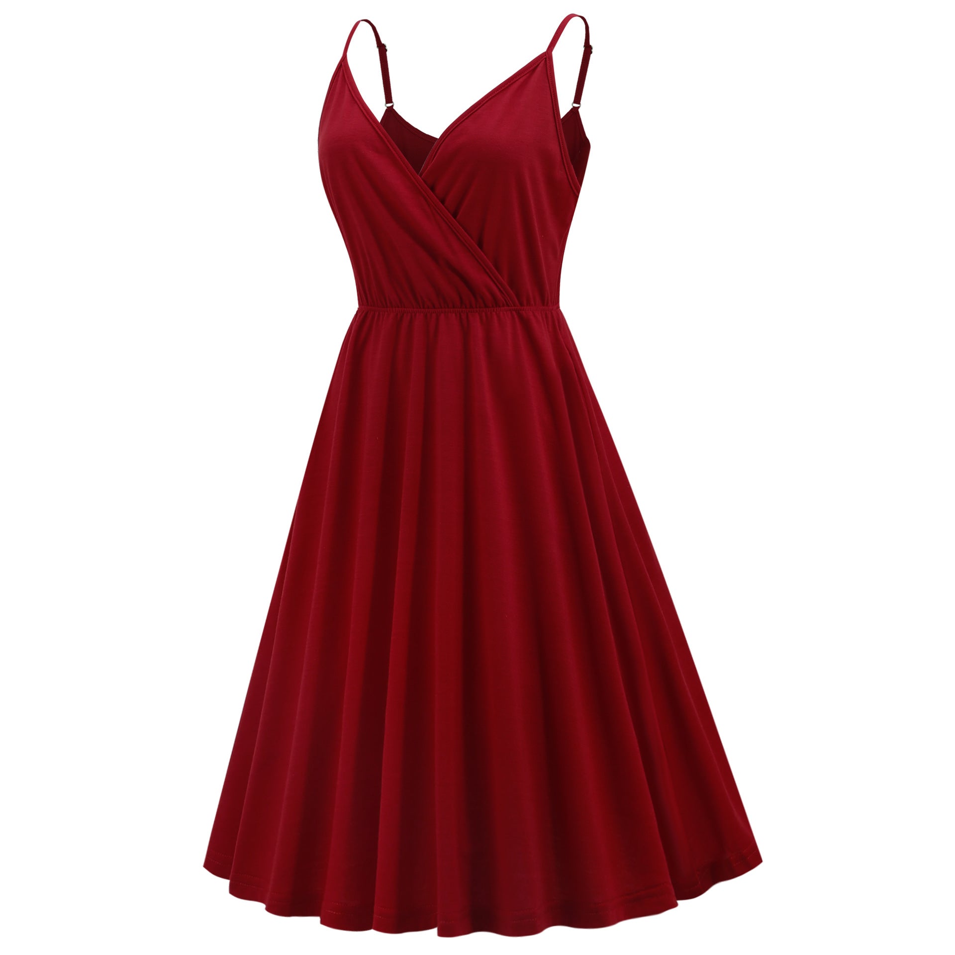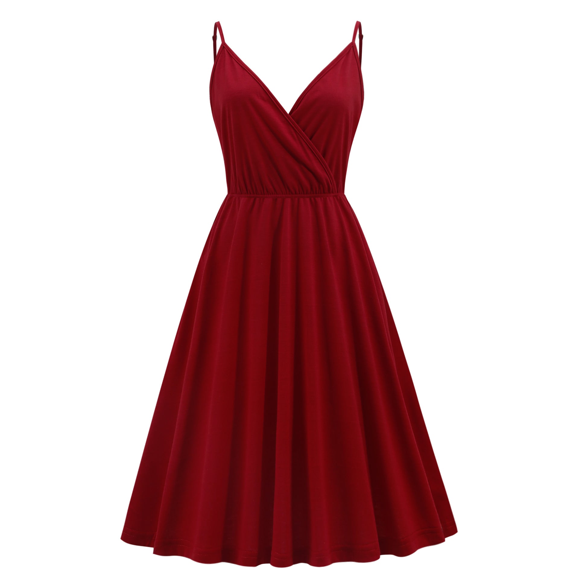 1950S Red Floral Print Spaghetti Strap V-Neck Vintage Dress