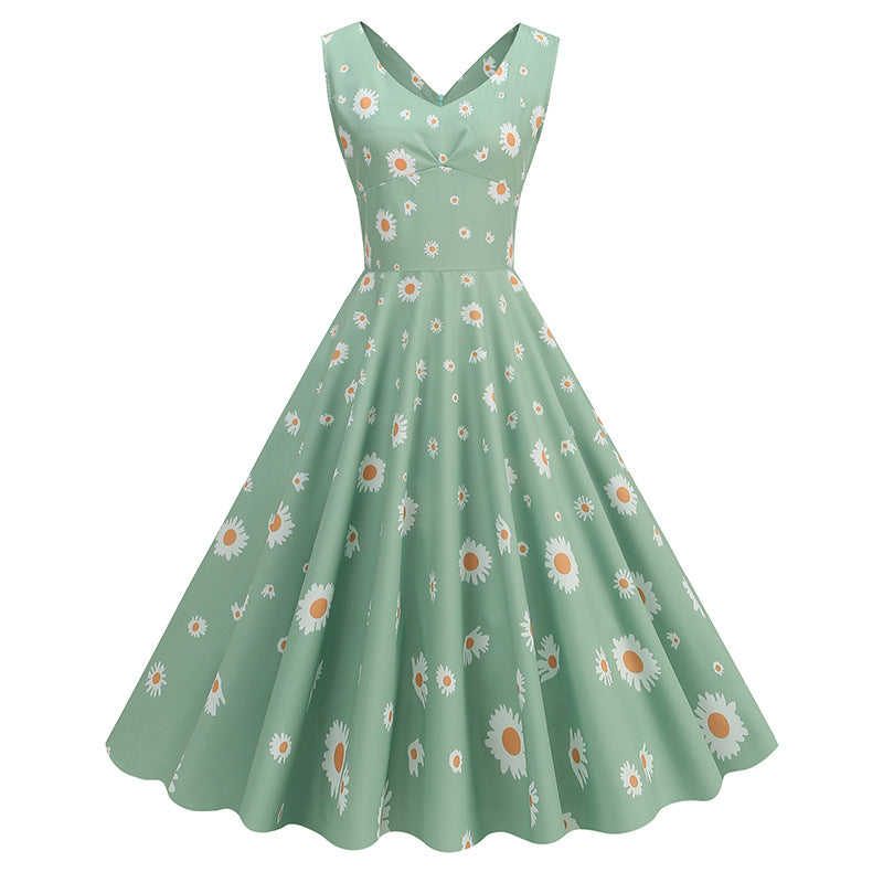 1950S Green Floral V-Neck Sleeveless Swing Vintage Dress