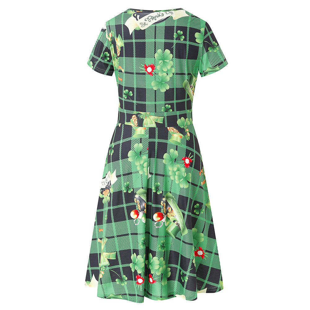 1950S Green Plaid Floral Print V-Neck Short Sleeve Vintage Dress
