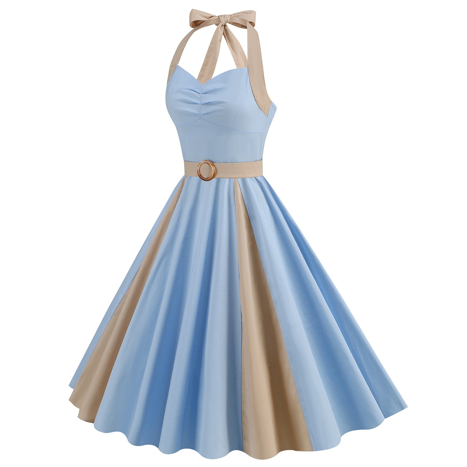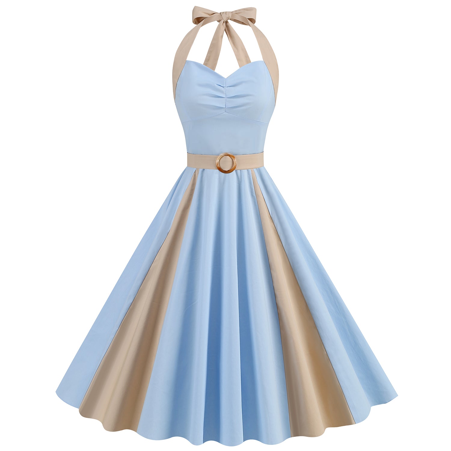 1950S Light Blue and Beige Retro Patchwork Belted Halter Vintage Dress