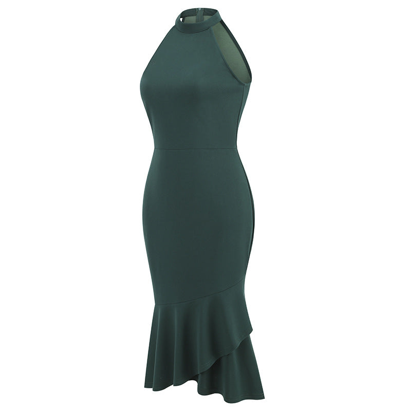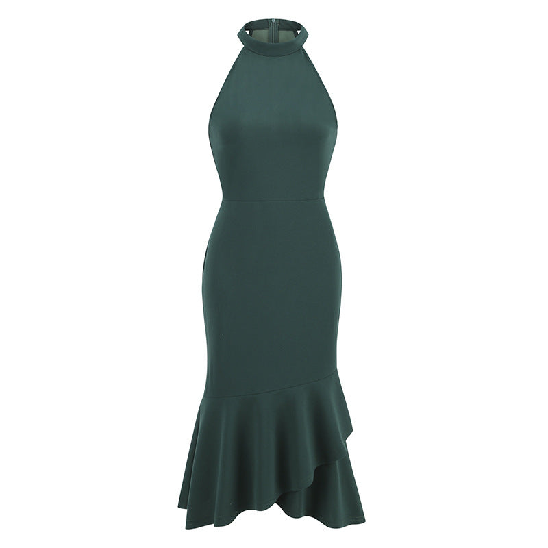 1950S Dark Green Halter Neck Ruffle Hem Sleeveless Vintage Dress