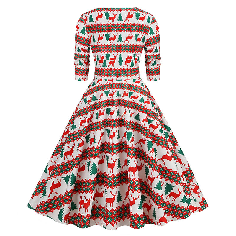 1950S Festive Red and Green Reindeer Print Belted Long Sleeve Vintage Dress