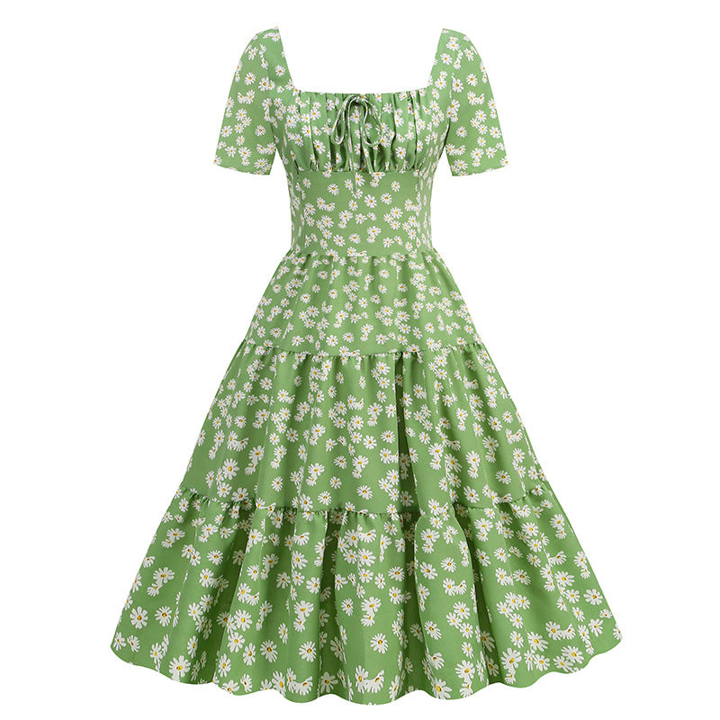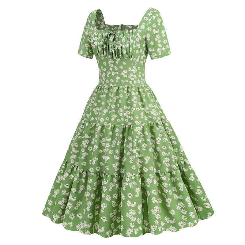 1950S Green Floral Print Square Neck Tiered Short Sleeve Vintage Dress