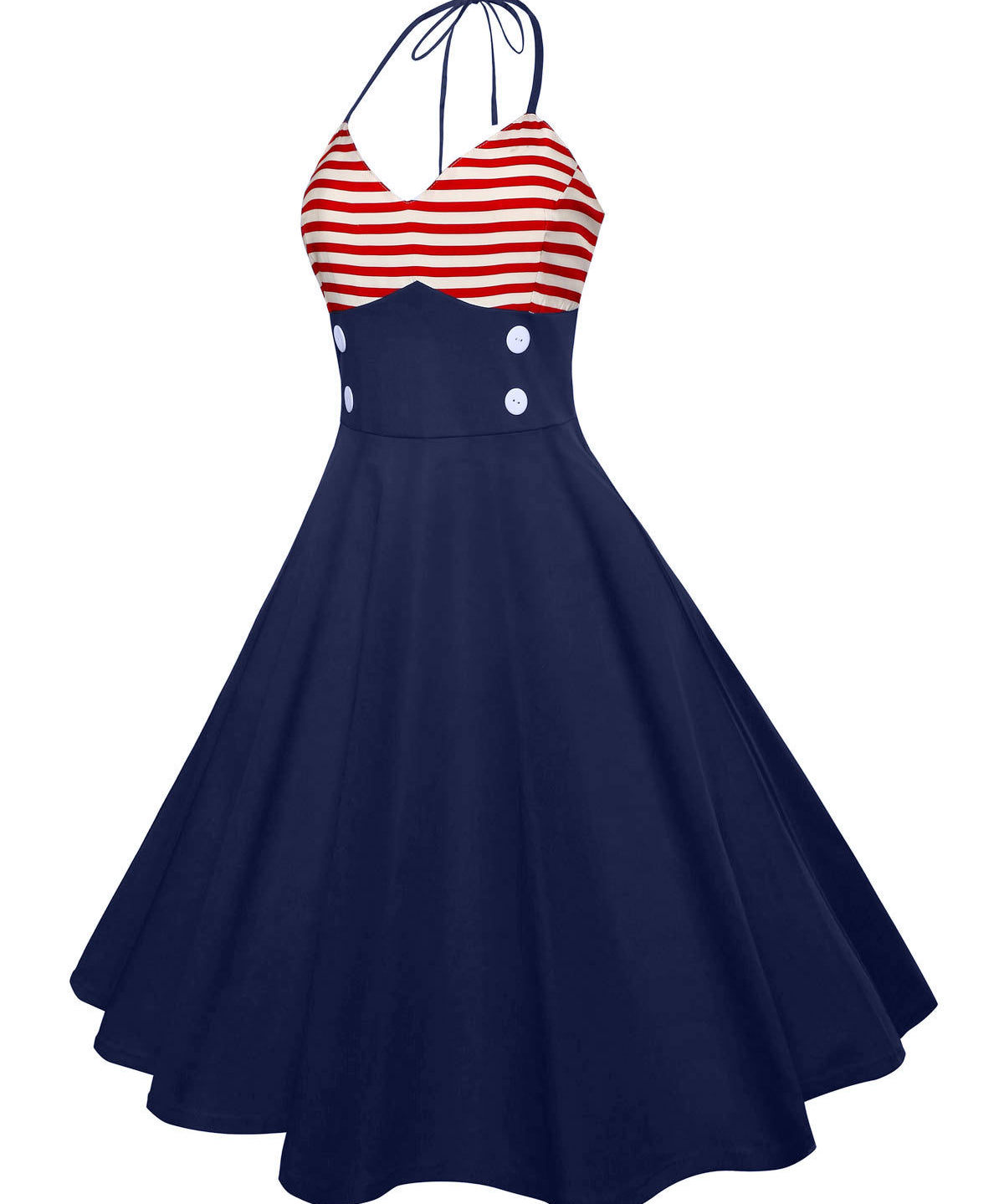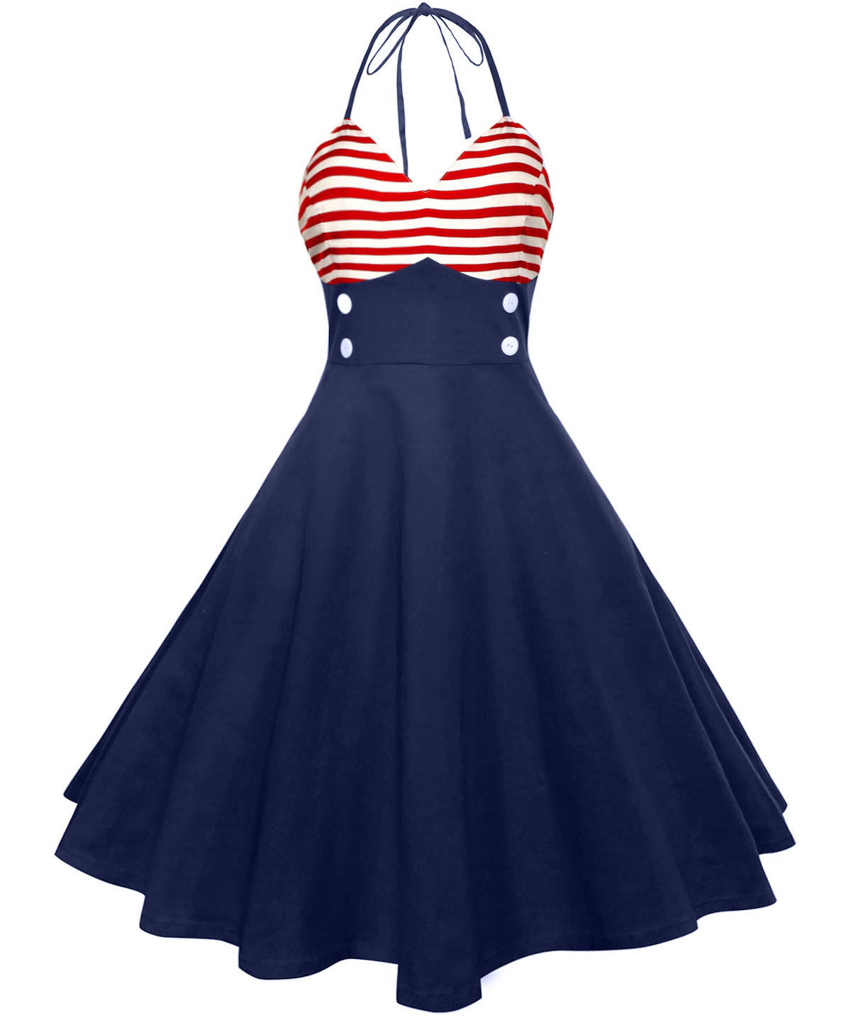 1950S Navy Blue Halter Striped Top Buttoned Vintage Dress