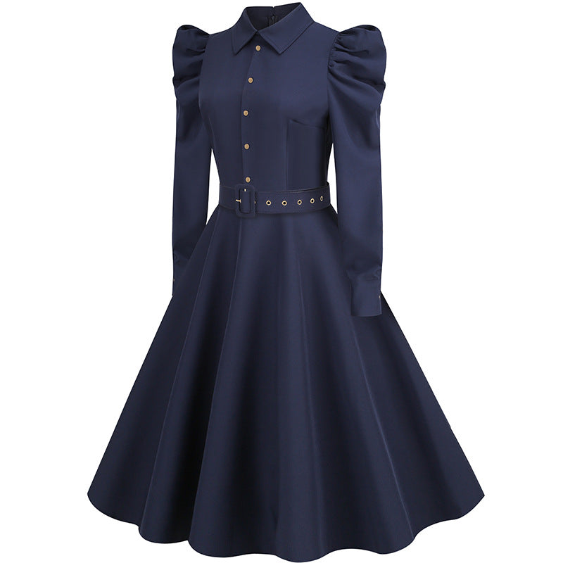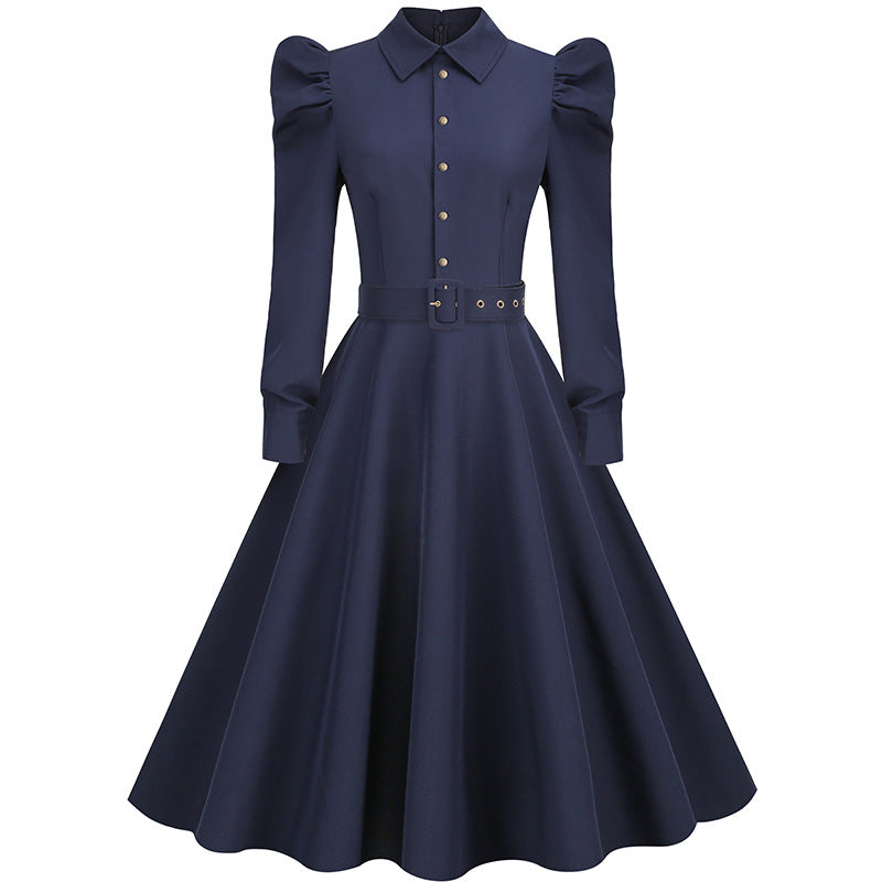 1950S Navy Blue Long Sleeve Belted Shirt Collar Vintage Dress