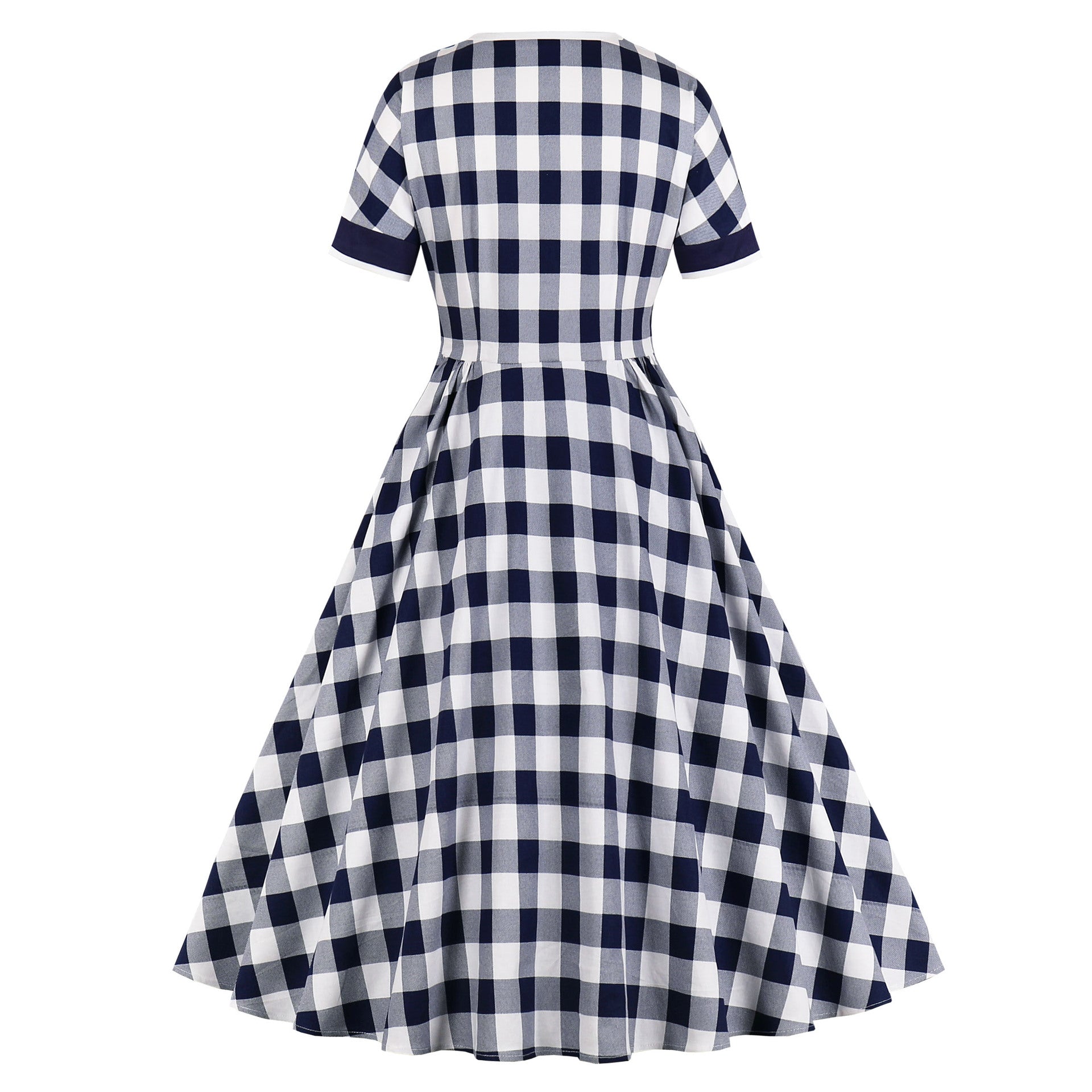 1950S Navy Blue Retro Plaid Patchwork Short Sleeve Vintage Dress