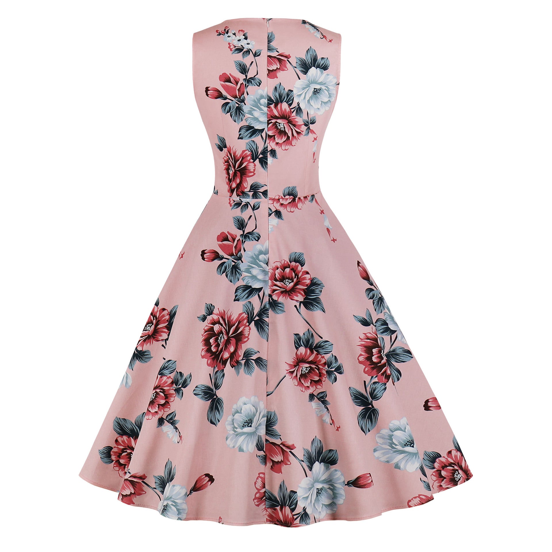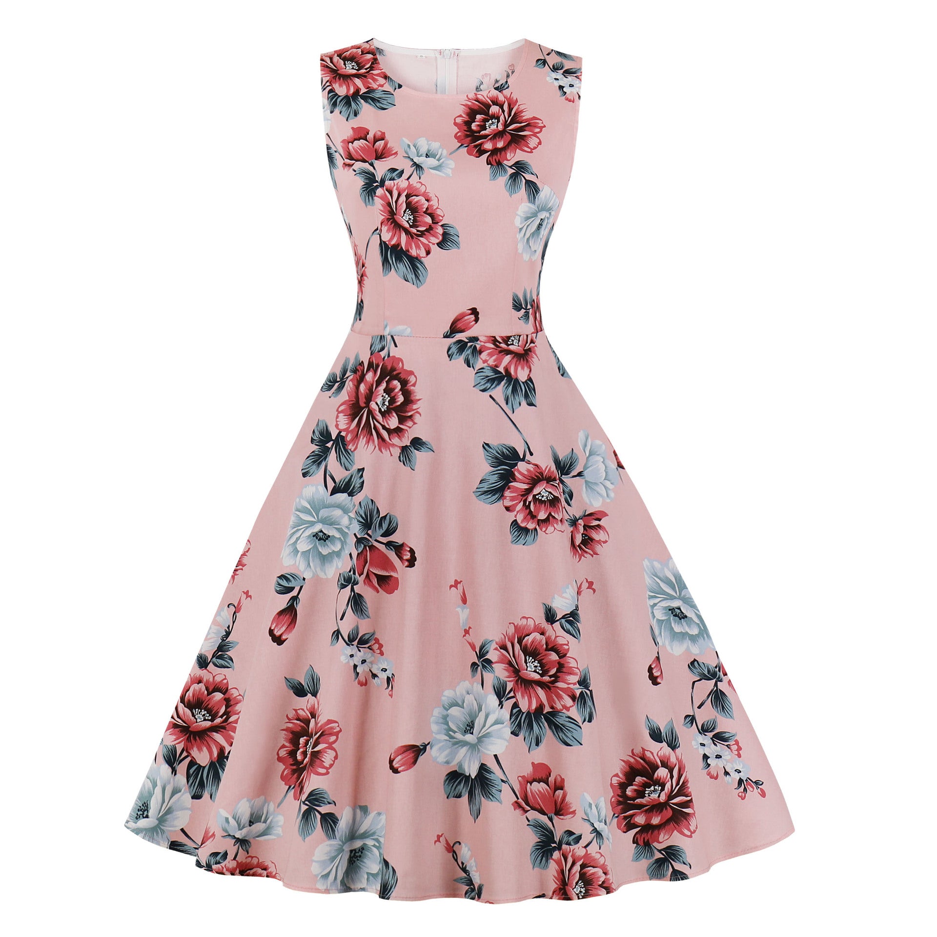 1950S Pink Floral Print Sleeveless Vintage Dress