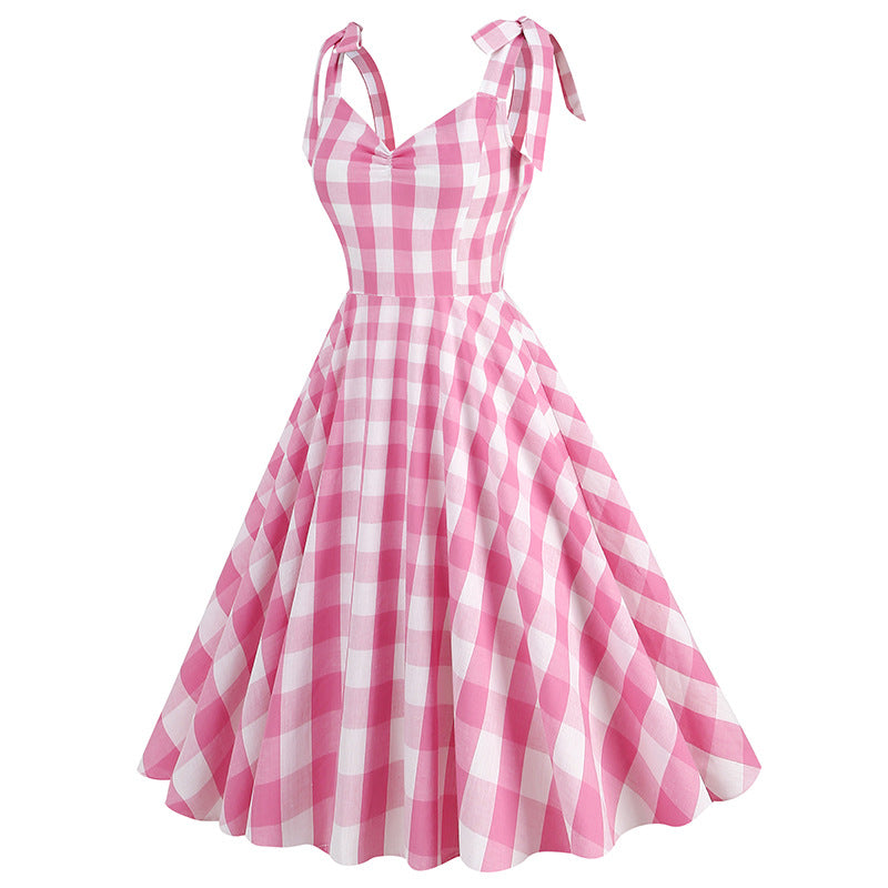 1950S Pink Plaid Retro Bow Detail Sleeveless Vintage Dress