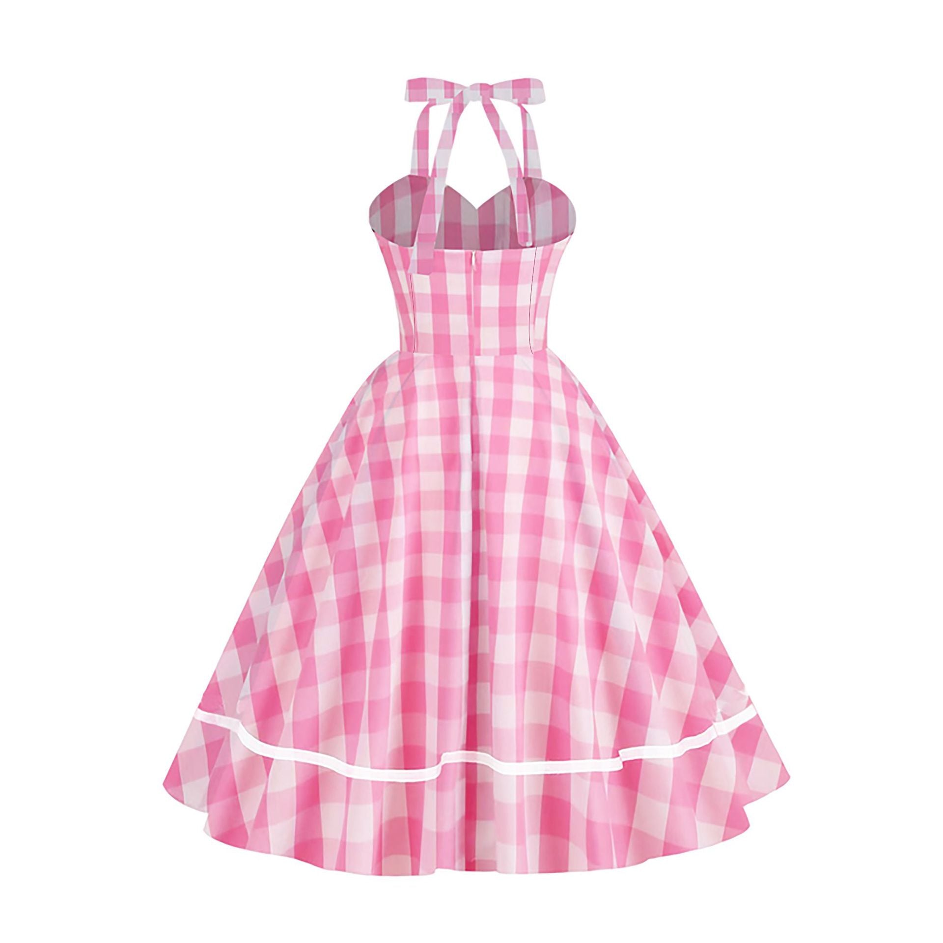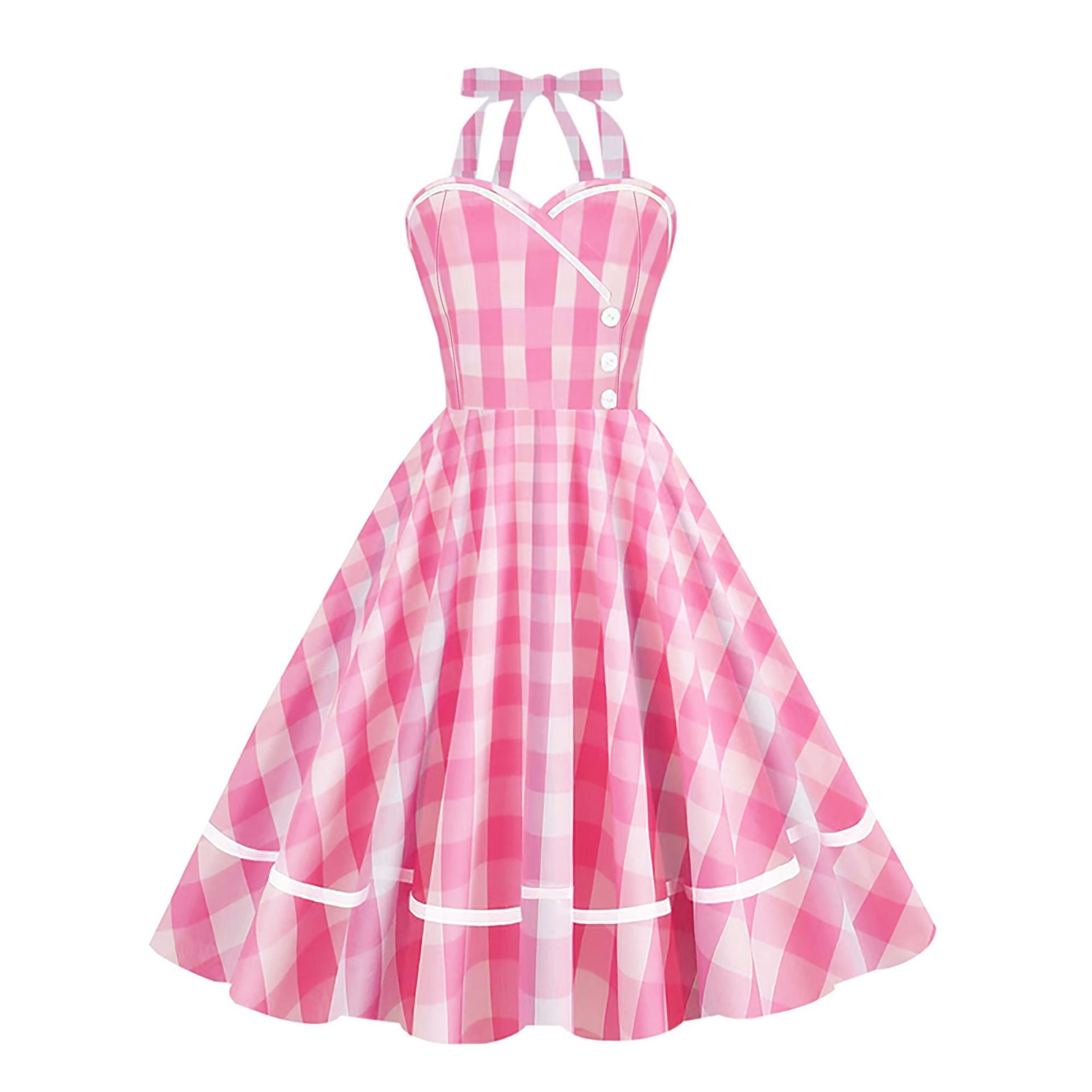 1950S Pink Plaid Retro Halter Button Detail Vintage Dress