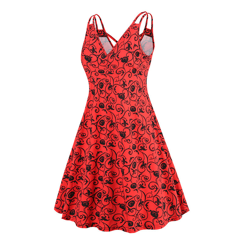 1950S Red and Black Floral Print Strappy Vintage Dress