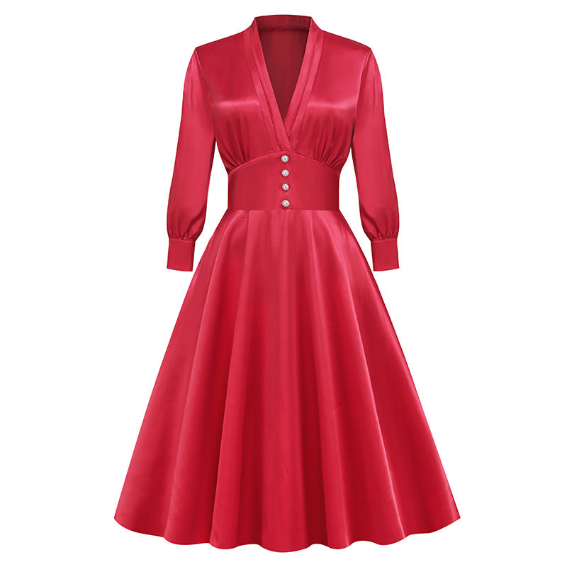 1950S Red Satin Buttoned Belted Long Sleeve Vintage Dress