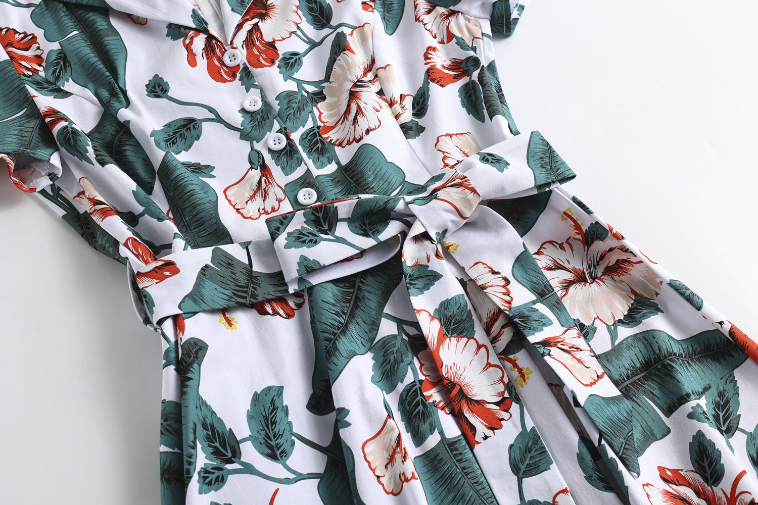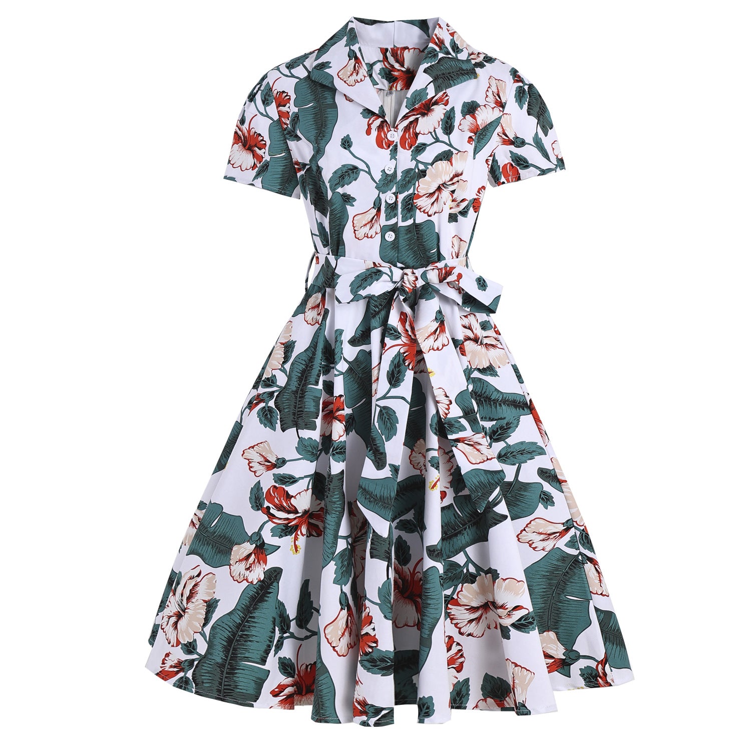Experience the 1950s with our charming Multi-Color Floral Button-Up Belted Short Sleeve Vintage Dress. The classic A-line cut flatters your figure, and the notched collar adds a timeless element. Its vibrant floral print and colorful fabric exudes vintage charm, making it perfect for any occasion.